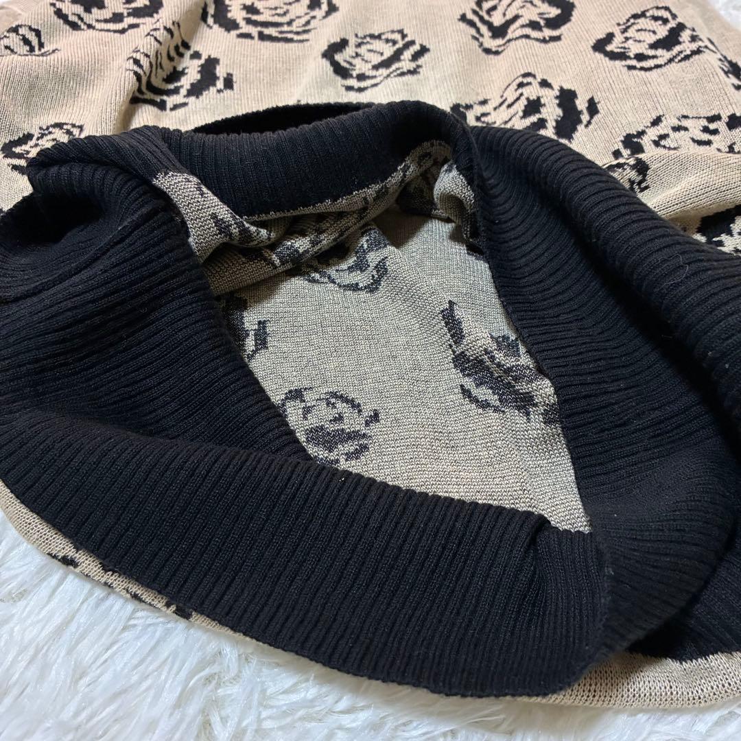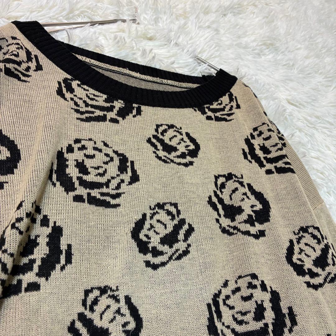 ファインモーション バラ柄セーター M ベージュ系 クルーネック チュニック丈
