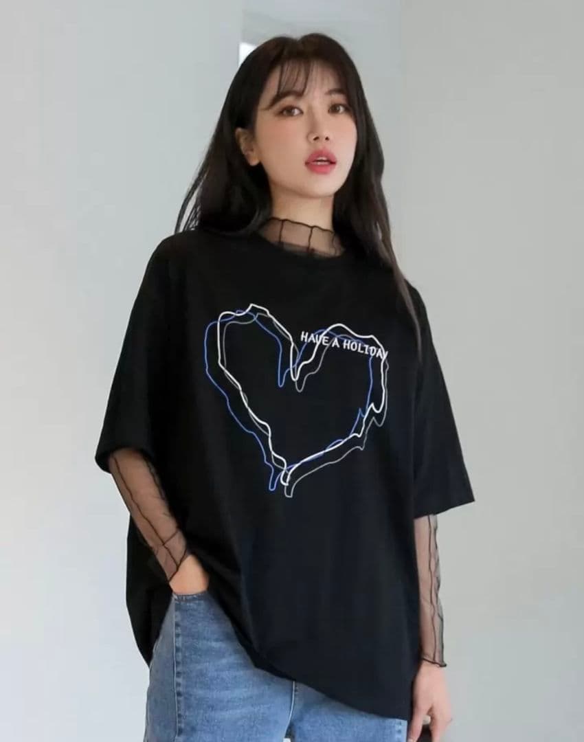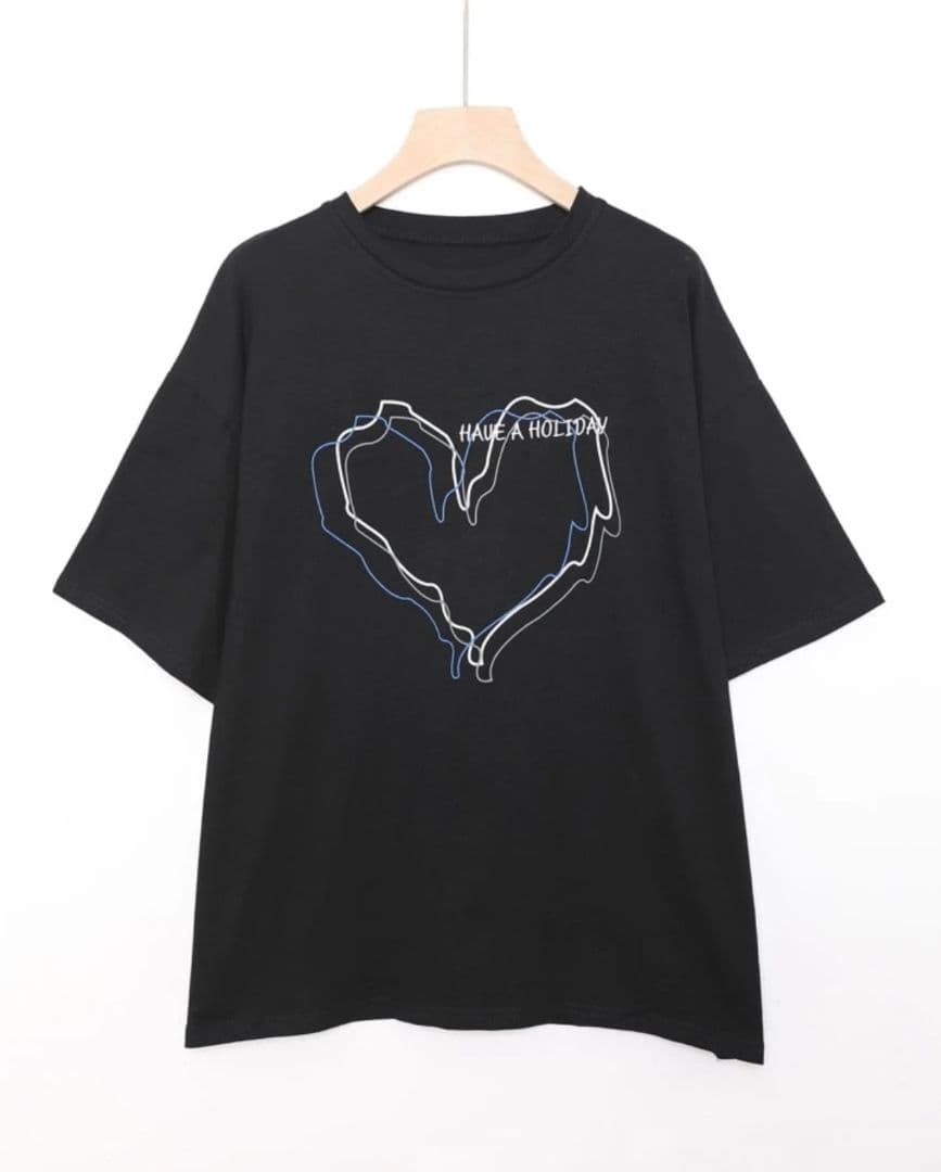 オーバーサイズ ハートグラフィック 刺繍 Tシャツブラック