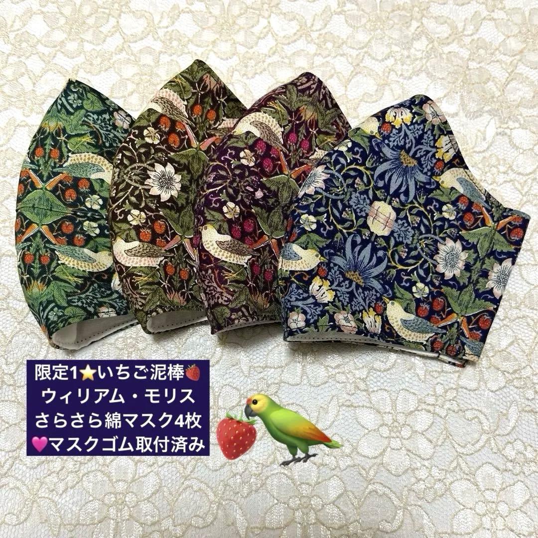 限定1⭐️③ウィリアム・モリスのいちご泥棒さらさら綿マスク4枚⭐️マスクゴム取付済