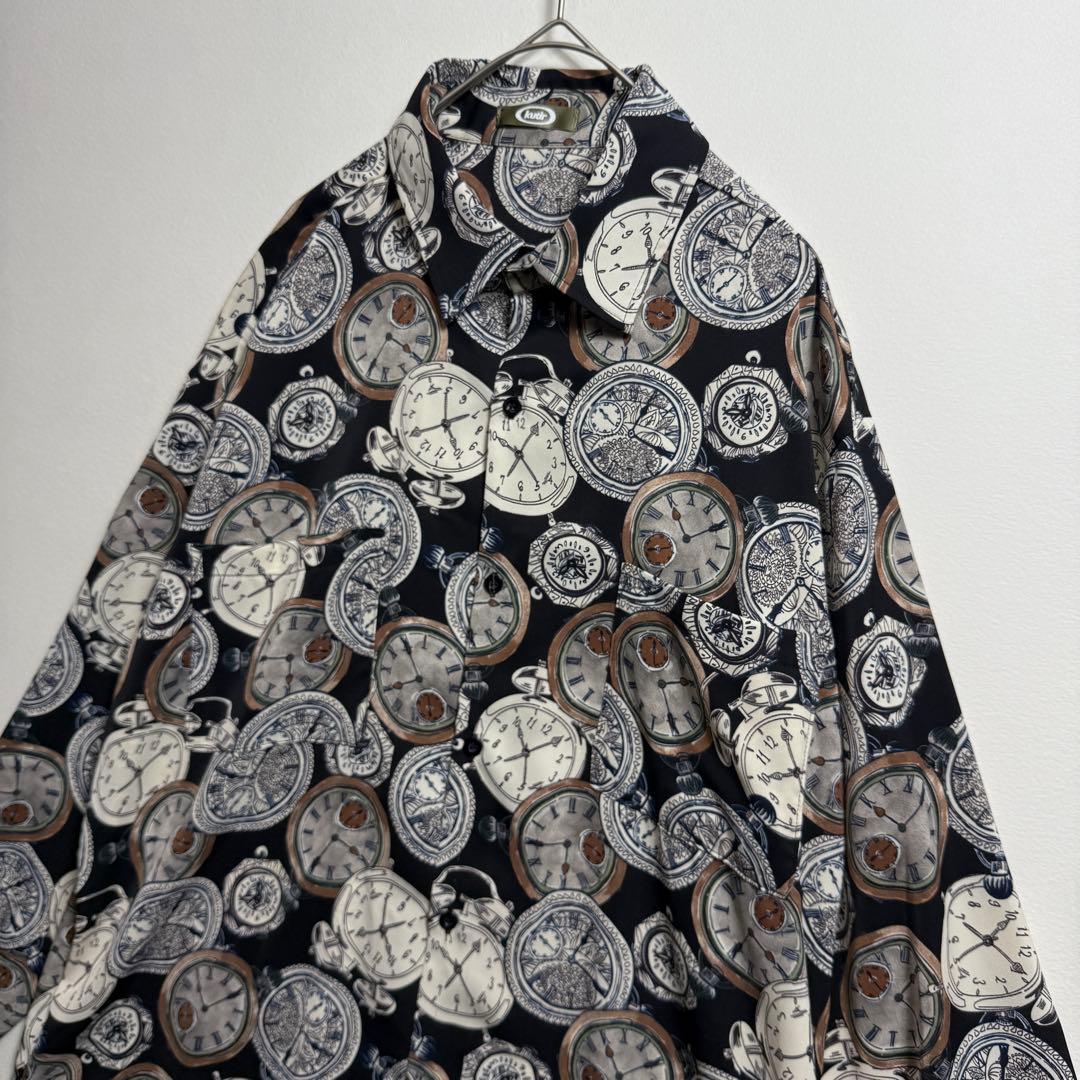 柄シャツ 総柄 長袖 シャツ 黒 白 ブラック ホワイト 時計模様 アート柄