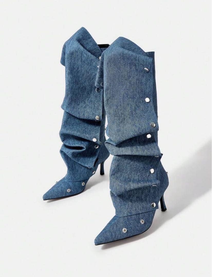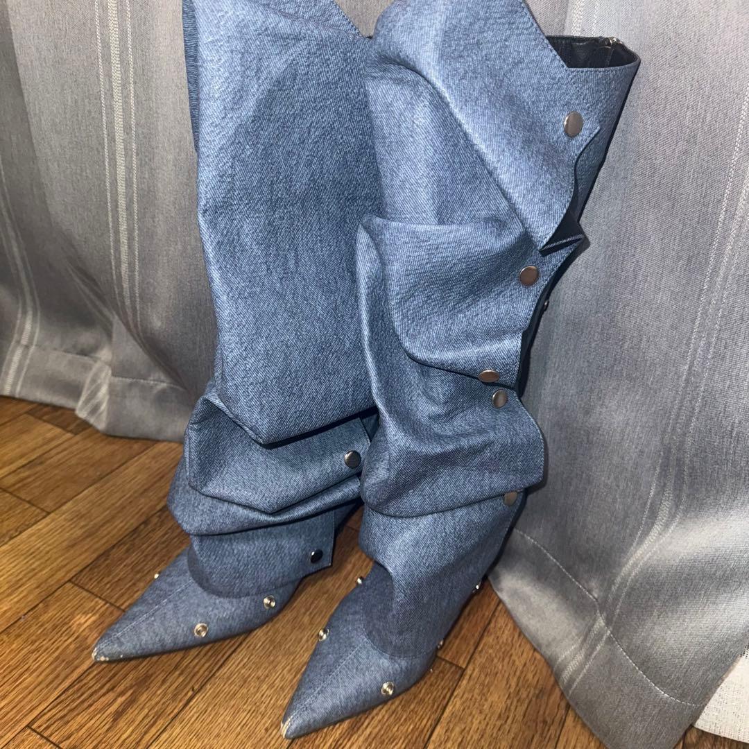 y2k❤︎デニムブルー プリーツ バックル デザインブーツ