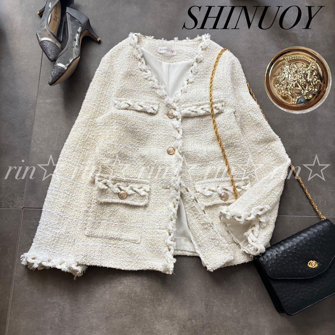 SHINUOY 韓国 ツイード ノーカラー ジャケット 金ボタン