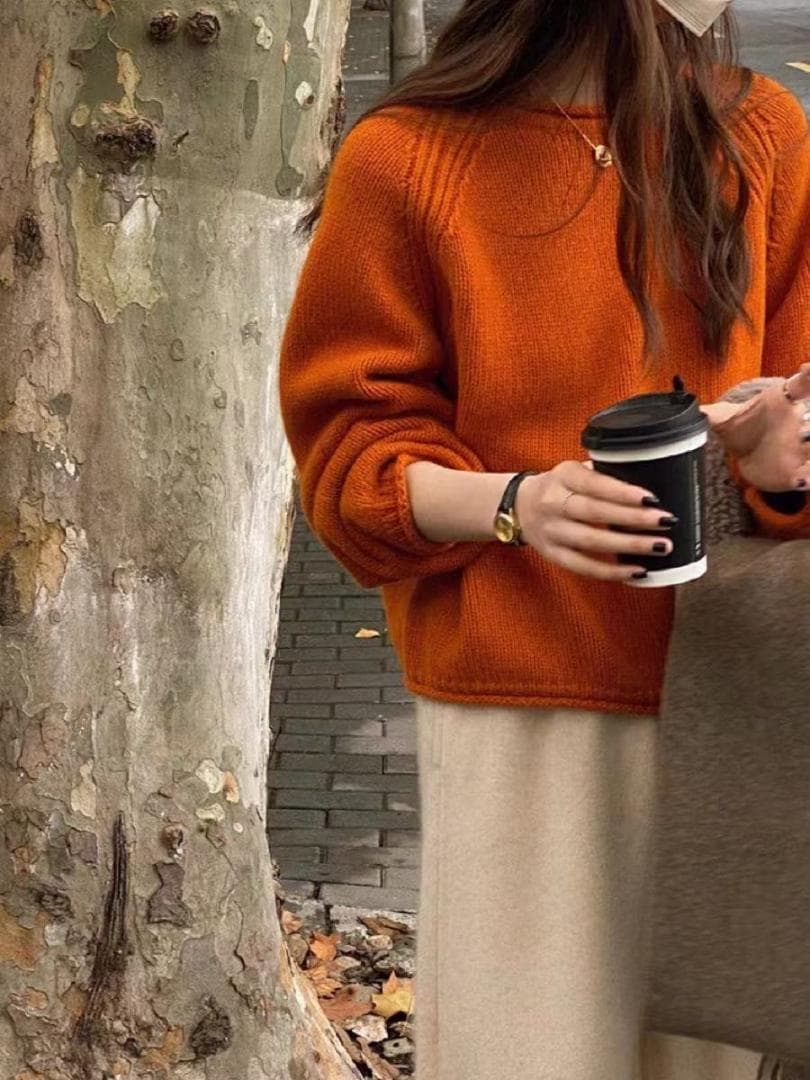 大人気 ニットセーター オレンジ 着回し抜群 クルーネック ニット セーター