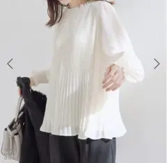 ベージュ プリーツ 半袖ブラウスLサイズ