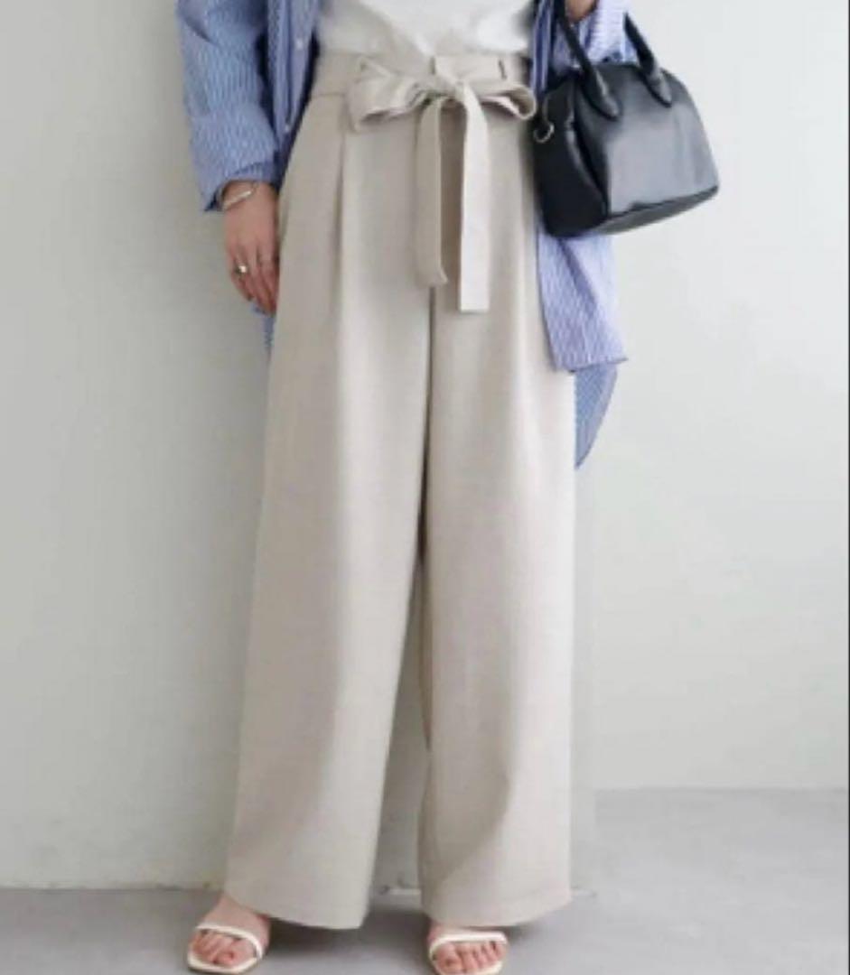 美品☆ディスコート☆テックリネンベルト付リラックスパンツ☆ライトグレー