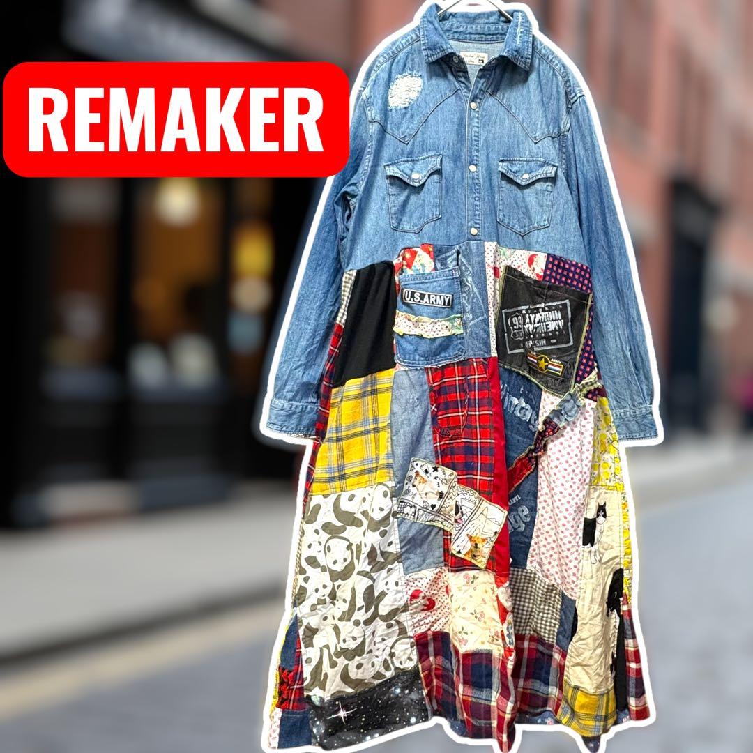 L✨ダメージデニムシャツ✨パッチワークロングスカート✨古着リメイクワンピース