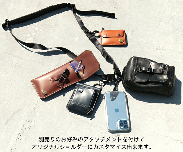 こちらは好きなアタッチメントを付けてオリジナルショルダーにカスタマイズ するベースとなるショルダー部分で、大小さまざまなリングはもちろん、ナイロンテープ部分にはループをつけることで、使う方の気分に合わせたカスタマイズが可能となっています。