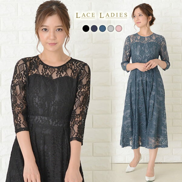 パーティードレス 総レース ワンピース 七分袖 ミモレ丈 レディース 袖付き 結婚式 二次会 お呼ばれ 披露宴 卒業式 入学式 花柄 レース 大きいサイズ 20代 30代 40代 黒 紺 ブラック ネイビー ピンク グリーン 春 夏 秋 冬