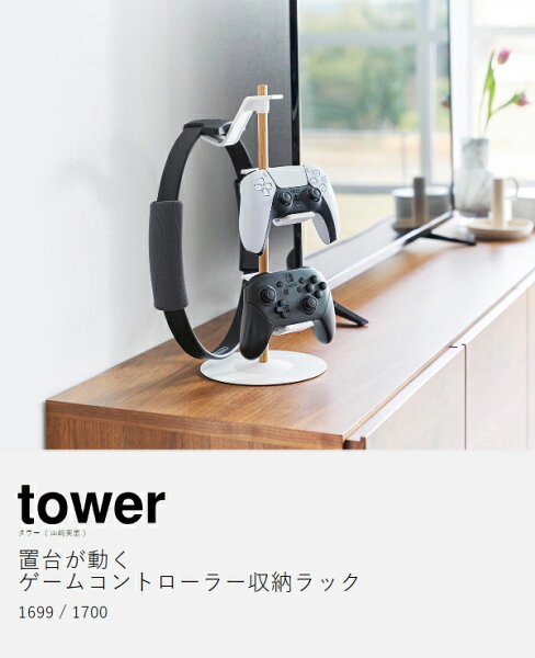 『 tower( タワー )置台が動くゲームコントローラー収納ラック 』は、置き場所に困るゲームコントローラーを3台収納できるスリムなスタンド。縦にならんだデザインは場所を取らず、テレビ周りやデスクにも省スペースに設置できます。置台は高さと向きが変えられるので、リングコントローラーやヘッドホンなども一緒に収納OK。ケーブルを通せるスリット付きで、充電しながら収納できるのも◎。天然木のバーがアクセントになったシンプルなデザインも魅力です。
