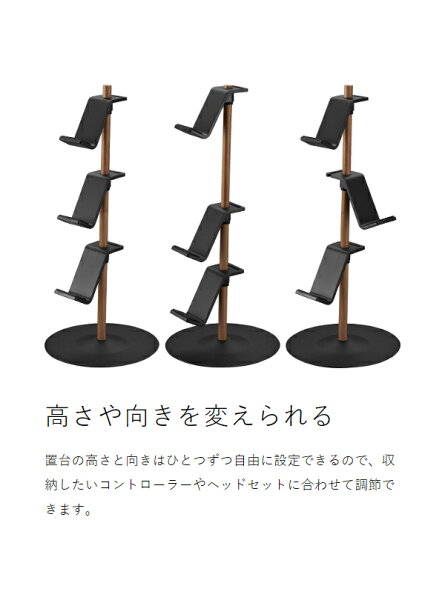 置台の高さと向きはひとつずつ自由に設定できるので、収納したいコントローラーやヘッドセットに合わせて調節できます。