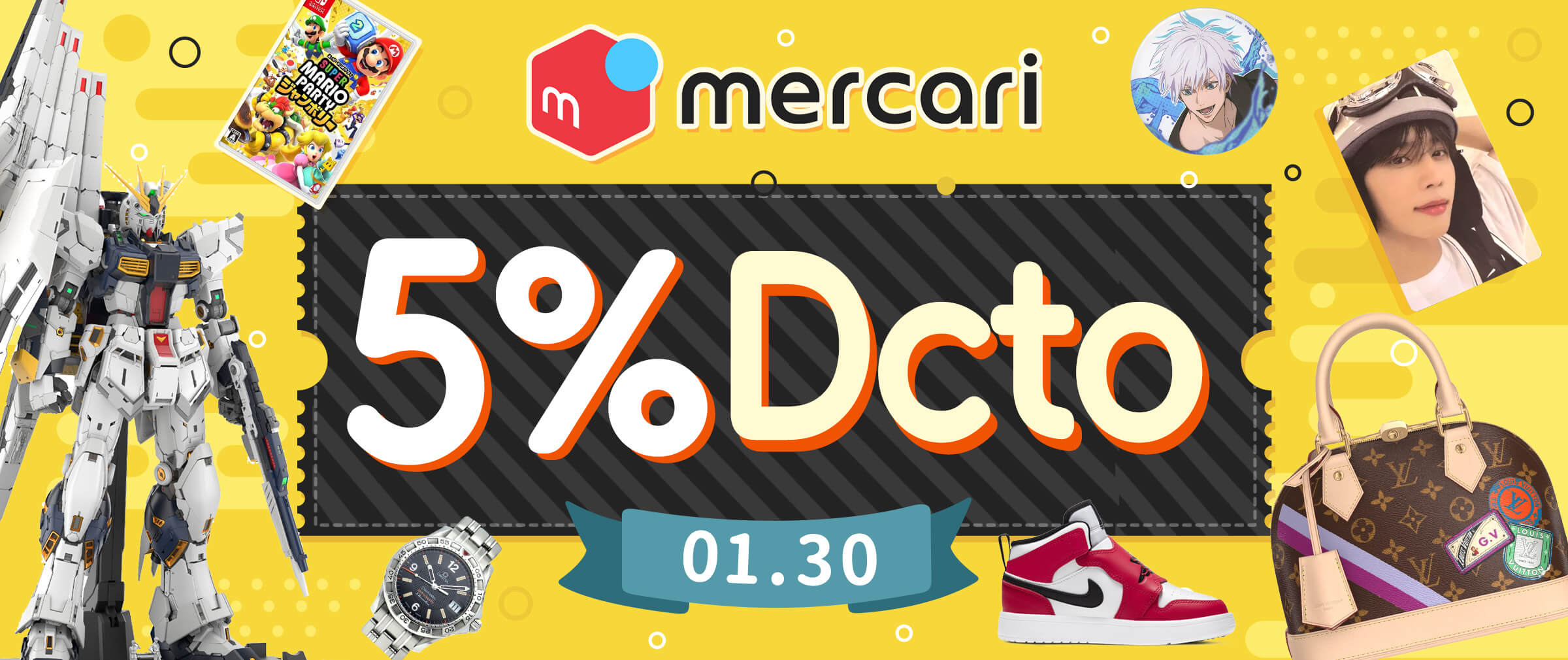 1. Este cupón es válido en todos los sitios de nuestra plataforma (excepto Anybuy y JDirectItems Auction), incluido JDirectItems Fleamarket, para pedidos superiores a 15,000 JPY. Otorga un cupón de descuento que ofrece un 5% de descuento en pedidos de Mercari superiores a 3,000 JPY. Este cupón puede usarse del 31 de enero al 3 de febrero de 2026 y caducará después de esa fecha.