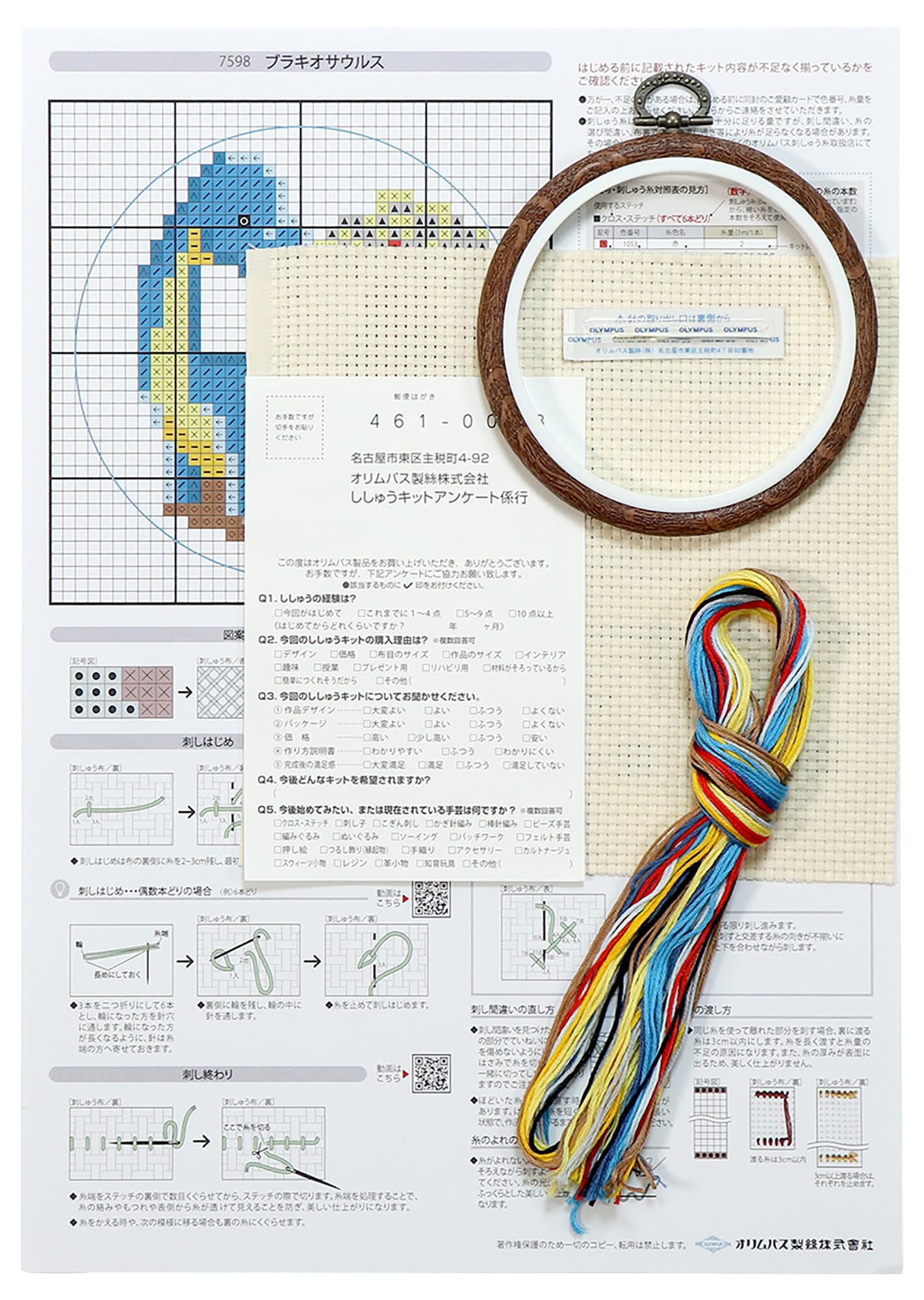 | 付属コンポーネント: | 刺しゅう糸、クロス針、カラー図案、説明書、おしゃれフープ、縫い糸、縫い針、はさみ |