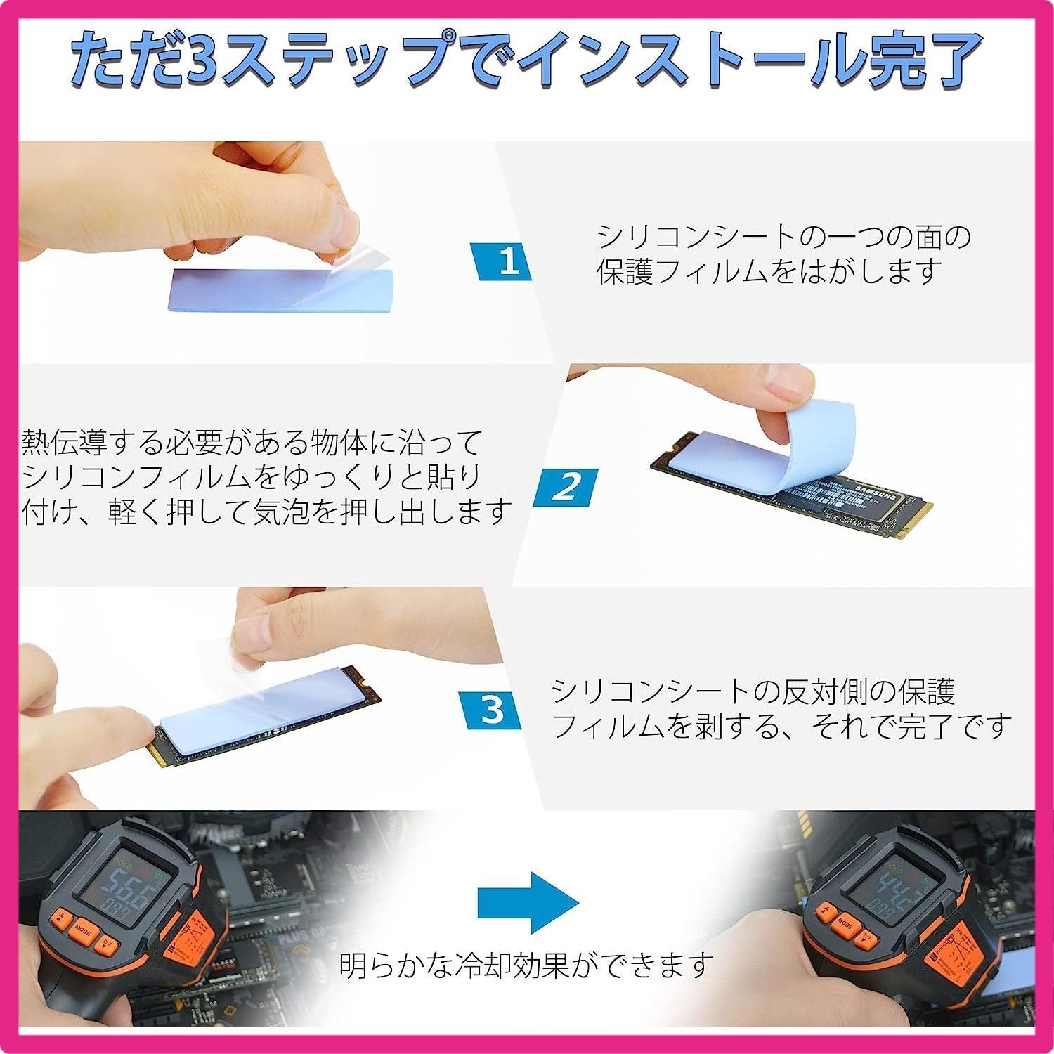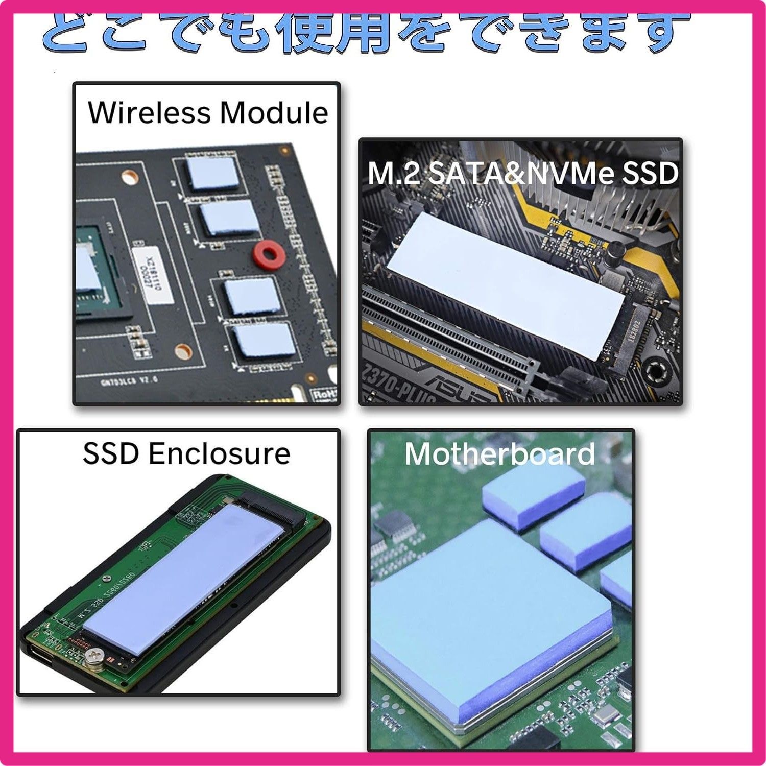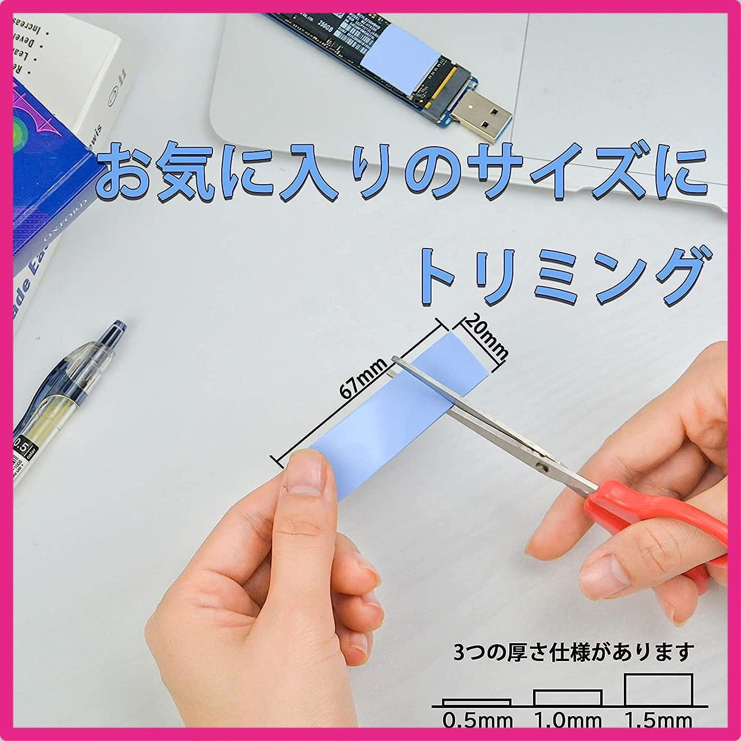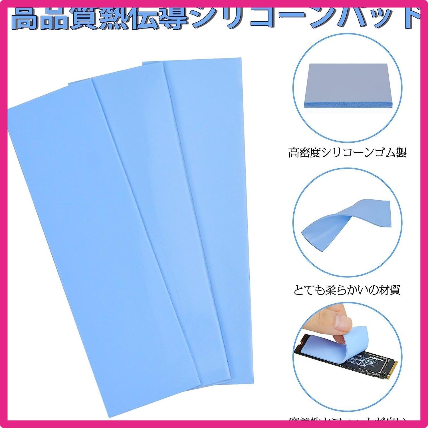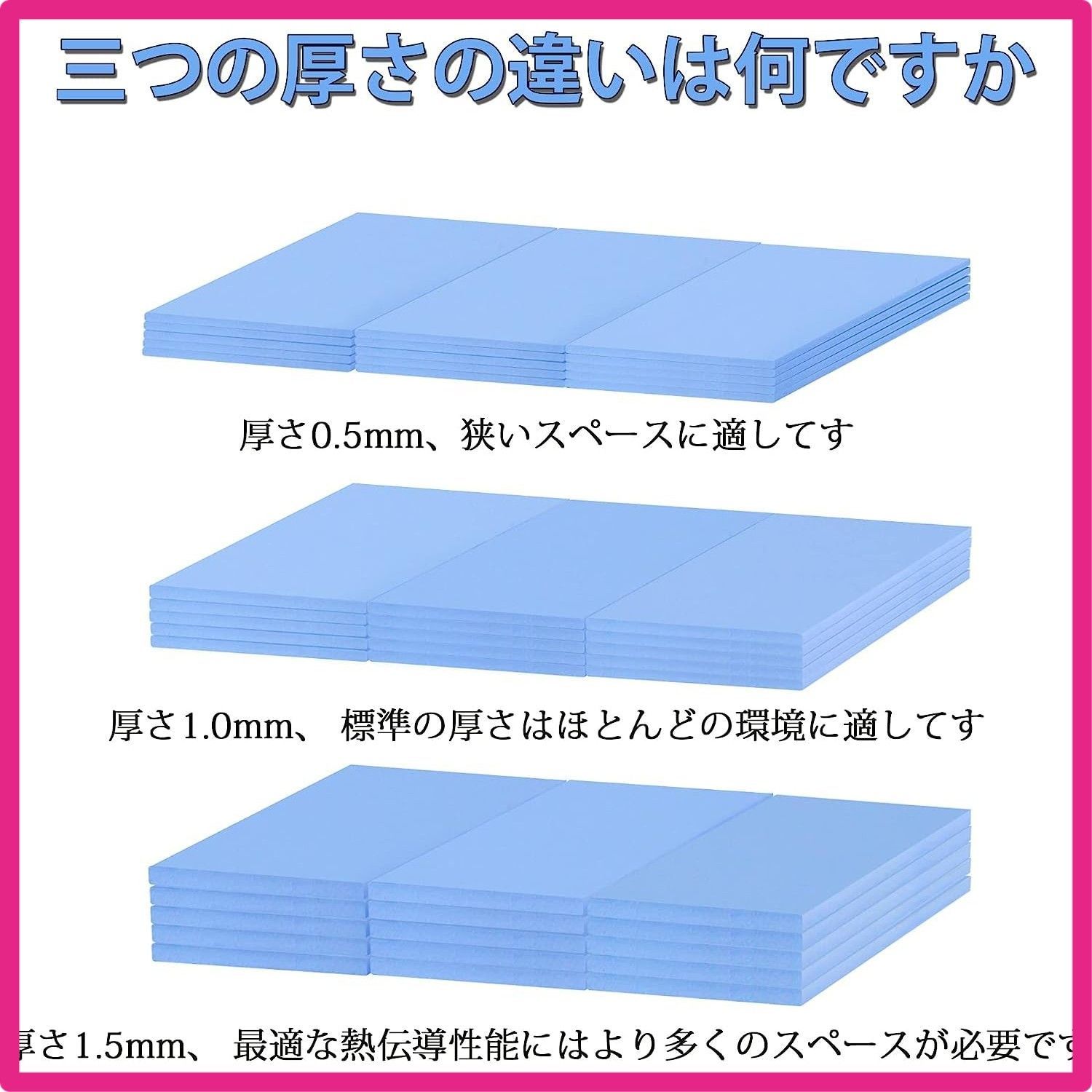 当店をご利用いただき誠にありがとうございます。 全品全国送料無料となっております。 簡易宅配便を利用するためポスト投函および玄関前置き配が基本となります 置き配が不可の場合やオートロックマンションの場合は 希望のお日にちお時間等お知らせいただけたら極力ご希望にそえるように努力いたします。 当店では他サイトにも商品を販売しているため まれに売り切れや取り寄せ中となる場合がありますがご了承ください。 6 Rongdeson サーマルパッド 6パック 3種類の厚さ 熱暴走対策 冷却ラジエーターフィン 両面放熱シリコーンパッド 熱伝導性6.0 W/mk 軟らか材質 SSD CPU GPU LED ICチップセット冷却用 ブルー 高品質放熱シリコンシート×6 (厚さ1.5mm×厚さ2枚、厚さ1.0mm×厚さ2枚、厚さ0.5mm×2枚) 6.0W/MKの熱伝導率。 加熱要素とヒートシンクの間の隙間を埋めるために使用され、最高の冷却効果を発揮します 電気絶縁体は-40℃~200℃で溶けません。 耐摩耗性、帯電防止、難燃性、クッション性、非毒性、無臭、腐食なし、刺激なし、金属材料への損傷なし 素材は柔らかく、圧縮・放熱性能が優れており、厚みは広い範囲で調整でき、空洞の充填に適しており、両面が自然な粘度で、操作やメンテナンスが簡単です。 強い M.2 SSD、ワイヤレスモジュール、ICチップ、電源アダプター、精密機器、内部ボード、CPU、各種小型電子機器の放熱に使用できます " 本製品の材料は柔らかく、圧縮性能と放熱性能は良好で、厚さは広い範囲で調整でき、キャビティを埋めるのに適しており、両側は自然な粘度を有し、そして操作性とメンテナンス性は強い。 熱伝導シート SSD CPU GPU LED ICチップセット冷却用。 製品の特性 サイズ:20x67mm 厚さ:0.5mm / 1.0mm / 1.5mm 高品質の放熱シリコーンシートx6(1.5mm厚×2枚、1.0mm厚×2枚、0.5mm厚×2枚) 3つの厚さのシリコンパッドがあり、必要に応じて適切な厚さを選択して使用できます "