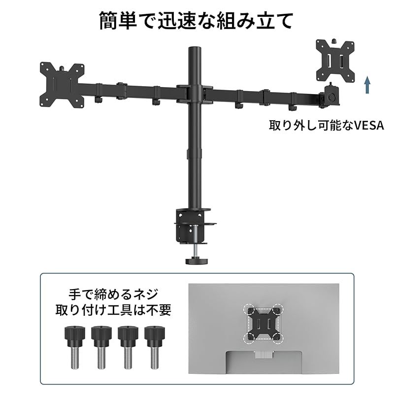 【商品概要】 【デュアルモニターアーム】このモニターアーム デュアルは13~27インチのモニターを2台同時にサポートし、各アームの耐荷重は10kgです。VESA規格75x75mmおよび100x100mmに対応しており、様々なモニターを取り付けることができます 【フルモーション調整可能】モニターアームはフルモーション機能を備えており、360度回転、180度の左右スイベル、±90度の上下チルト調整が可能です。アームの高さも430mmまで調整でき、最適な視野角を実現します。ご注意:付属の六角レンチでボルトを締めて傾斜角度を固定します。一方のモニターが低い場合は、ナットを取り外し、付属の六角レンチでボルトを反時計回りに回してモニターを上げます。調整後、ナットを取り付けます 【堅牢な構造】高品質な鋼材とアルミニウム合金を使用し、堅牢性と耐久性に優れた設計。1homefurnit モニターアームはオフィス、家庭、スタジオなど、あらゆる作業環境での長期使用に適しています。統合ケーブル管理システムにより、作業エリアをすっきりと保つことができます。 【人間工学に基づいたデザイン】デュアルモニターアームはモニターの配置を自由に調整できるため、長時間のデスクワークでも首、肩、腰への負担を軽減します。最適な姿勢を保つことで、作業効率と快適性が向上します 【簡単な組み立てと取り付け】取り外し可能なVESAプレートを採用し、組み立てと取り付けが簡単です。クランプ式とグロメット式の2種類の取り付け方法に対応し、デスクの厚さや形状に合わせて選べます。モニターアーム 2画面は取り付け用の全てのハードウェアと説明書が付属しています。ご使用中、何かご質問&ご不明な点がございましたら、連絡先【アカウントサービス】-【注文履歴】-【販売BONTEC】-【質問する】のほうでお気軽に弊社までご連絡くださいますようお願い申し上げます 【商品説明】 【デュアルモニターアーム】このモニターアーム デュアルは13~27インチのモニターを2台同時にサポートし、各アームの耐荷重は10kgです。VESA規格75x75mmおよび100x100mmに対応しており、様々なモニターを取り付けることができます 【フルモーション調整可能】モニターアームはフルモーション機能を備えており、360度回転、180度の左右スイベル、±90度の上下チルト調整が可能です。アームの高さも430mmまで調整でき、最適な視野角を実現します。ご注意:付属の六角レンチでボルトを締めて傾斜角度を固定します。一方のモニターが低い場合は、ナットを取り外し、付属の六角レンチでボルトを反時計回りに回してモニターを上げます。調整後、ナットを取り付けます 【堅牢な構造】高品質な鋼材とアルミニウム合金を使用し、堅牢性と耐久性に優れた設計。1homefurnit モニターアームはオフィス、家庭、スタジオなど、あらゆる作業環境での長期使用に適しています。統合ケーブル管理システムにより、作業エリアをすっきりと保つことができます。 【人間工学に基づいたデザイン】デュアルモニターアームはモニターの配置を自由に調整できるため、長時間のデスクワークでも首、肩、腰への負担を軽減します。最適な姿勢を保つことで、作業効率と快適性が向上します 【簡単な組み立てと取り付け】取り外し可能なVESAプレートを採用し、組み立てと取り付けが簡単です。クランプ式とグロメット式の2種類の取り付け方法に対応し、デスクの厚さや形状に合わせて選べます。モニターアーム 2画面は取り付け用の全てのハードウェアと説明書が付属しています。ご使用中、何かご質問&ご不明な点がございましたら、連絡先【アカウントサービス】-【注文履歴】-【販売BONTEC】-【質問する】のほうでお気軽に弊社までご連絡くださいますようお願い申し上げます 【商品詳細】 ブランド:1homefurnit 商品種別:パソコン・周辺機器 商品名:1homefurnit モニターアーム デュアル 13-27インチ対応 液晶ディスプレイアーム VESA:75x75mmまた100x100mm フルモーション調整 アーム 2画面 グロメット式&クランプ式 耐荷重10Kg(各アーム) 黒 適格請求書発行可 製造元:1homefurnit 商品番号:MDM002 色:ブラック 商品タイプ:2画面 シングル13?27インチ対応