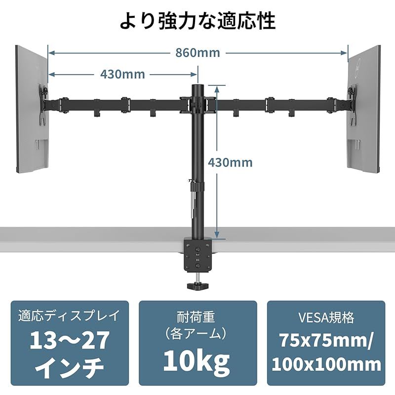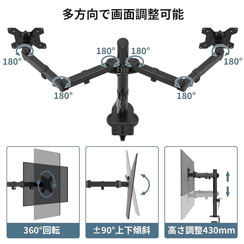 1homefurnit モニターアーム デュアル 13-27インチ対応 液晶ディスプレイアーム VESA:75x75mmまた100x100mm フルモーション調整 アーム 2画面 グロメット式&クランプ式 耐荷重10Kg(各アーム) 黒 適格請求書発行可