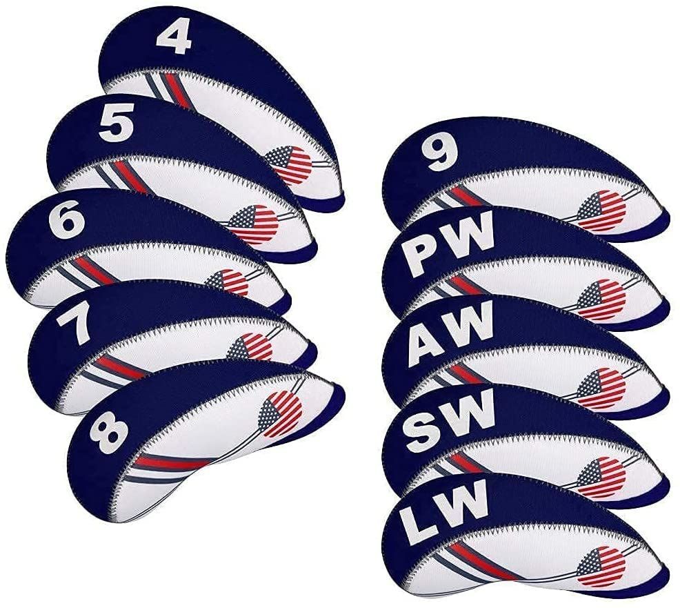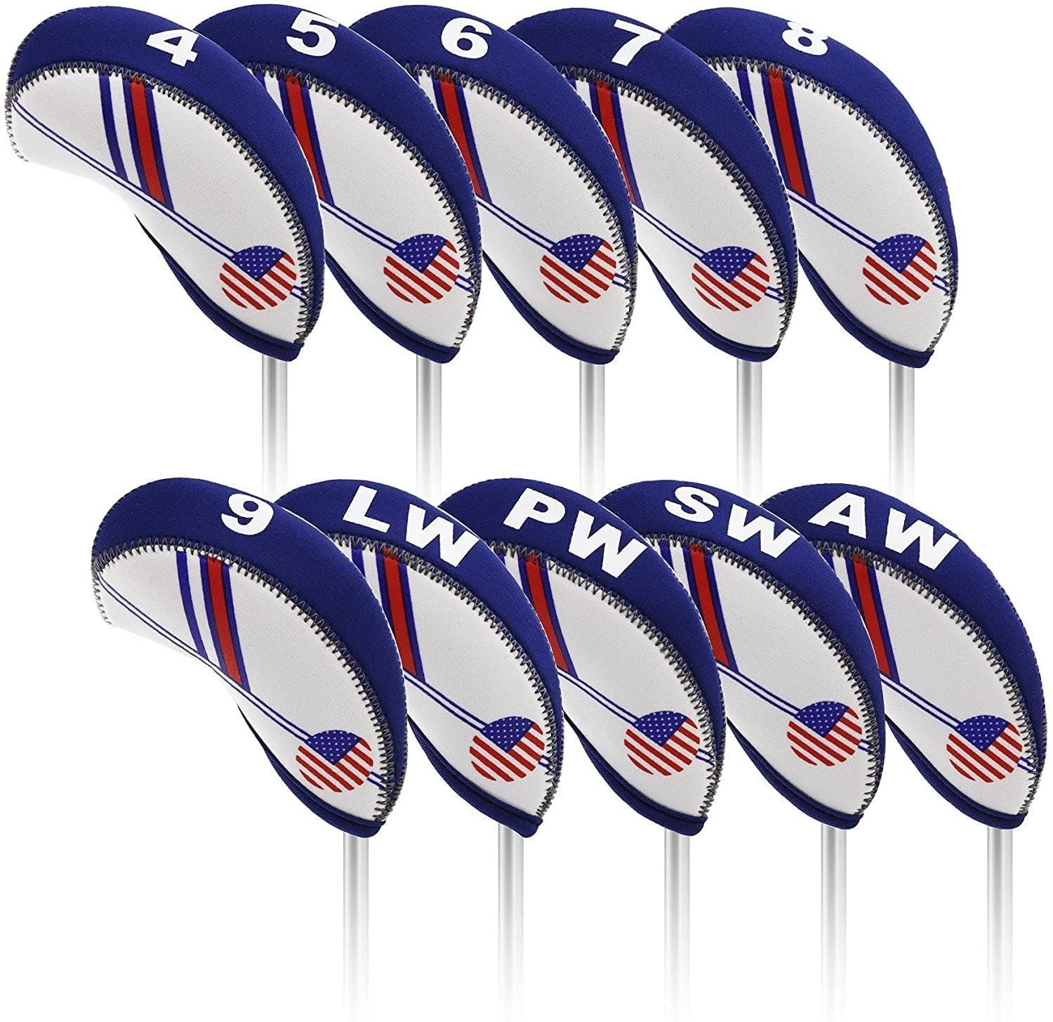 7 8 6 9 PW 5 AW 4 SW LW番 10点セット 番手付 アイアン用 ネオプレーン製 伸縮性 アイアンカバー USA ゴルフヘッドカバー 米国旗
