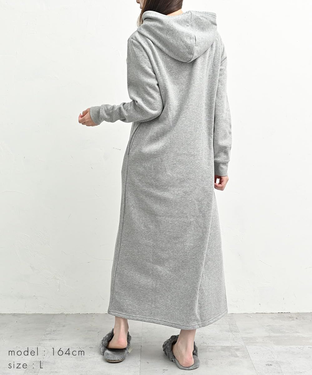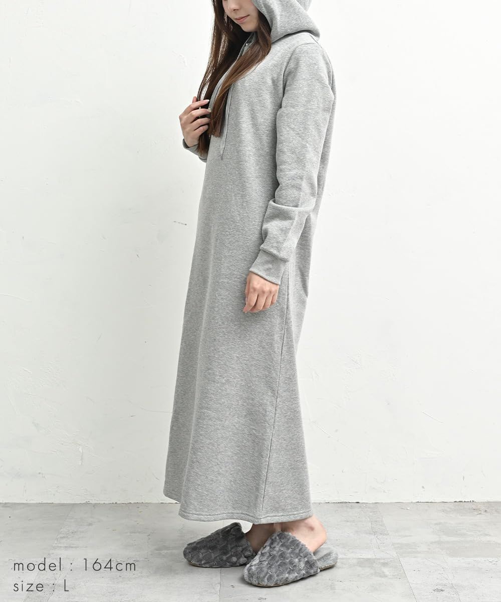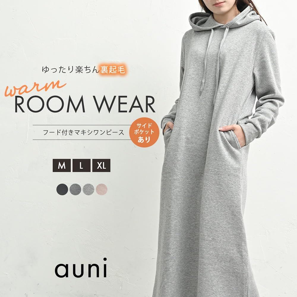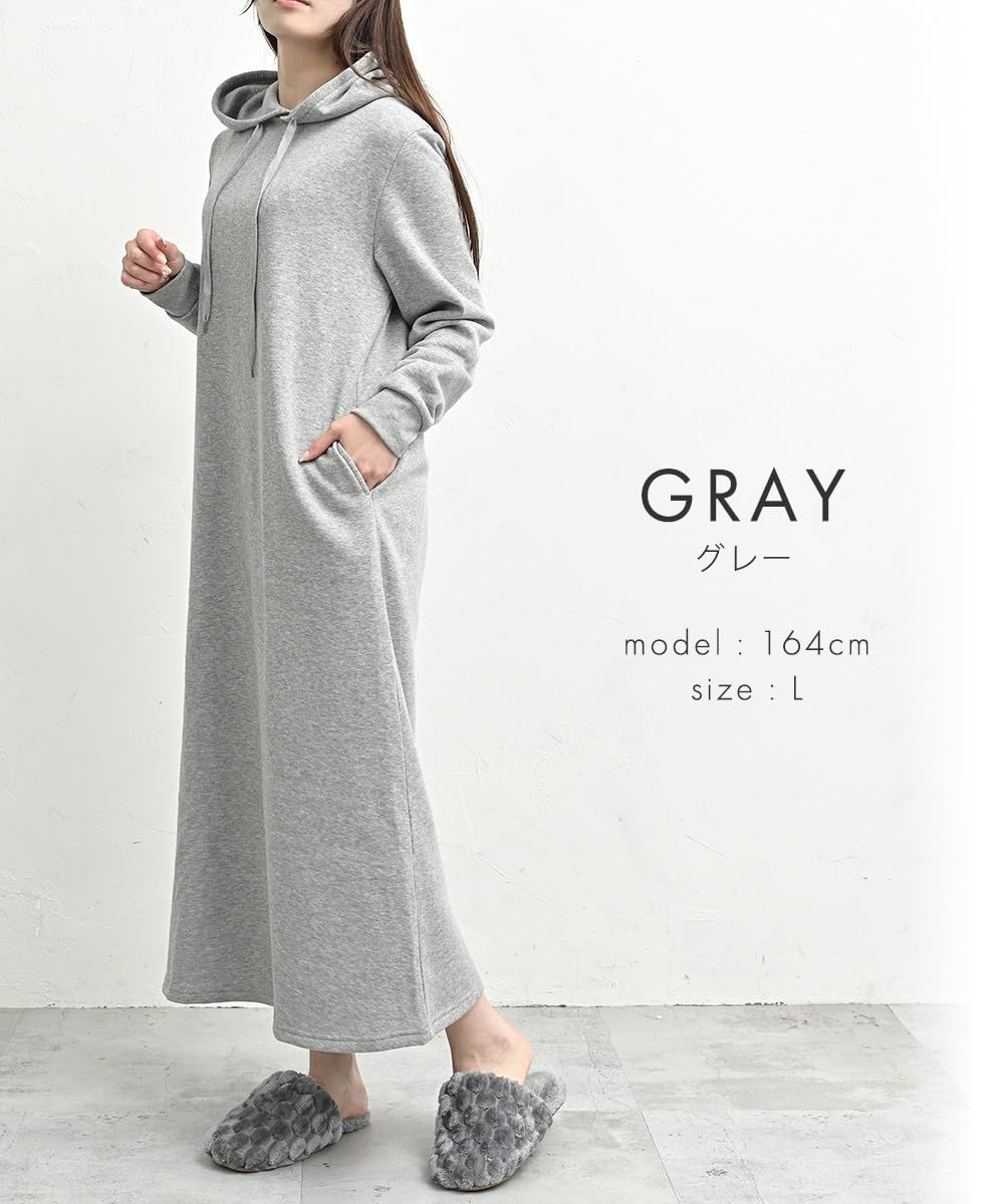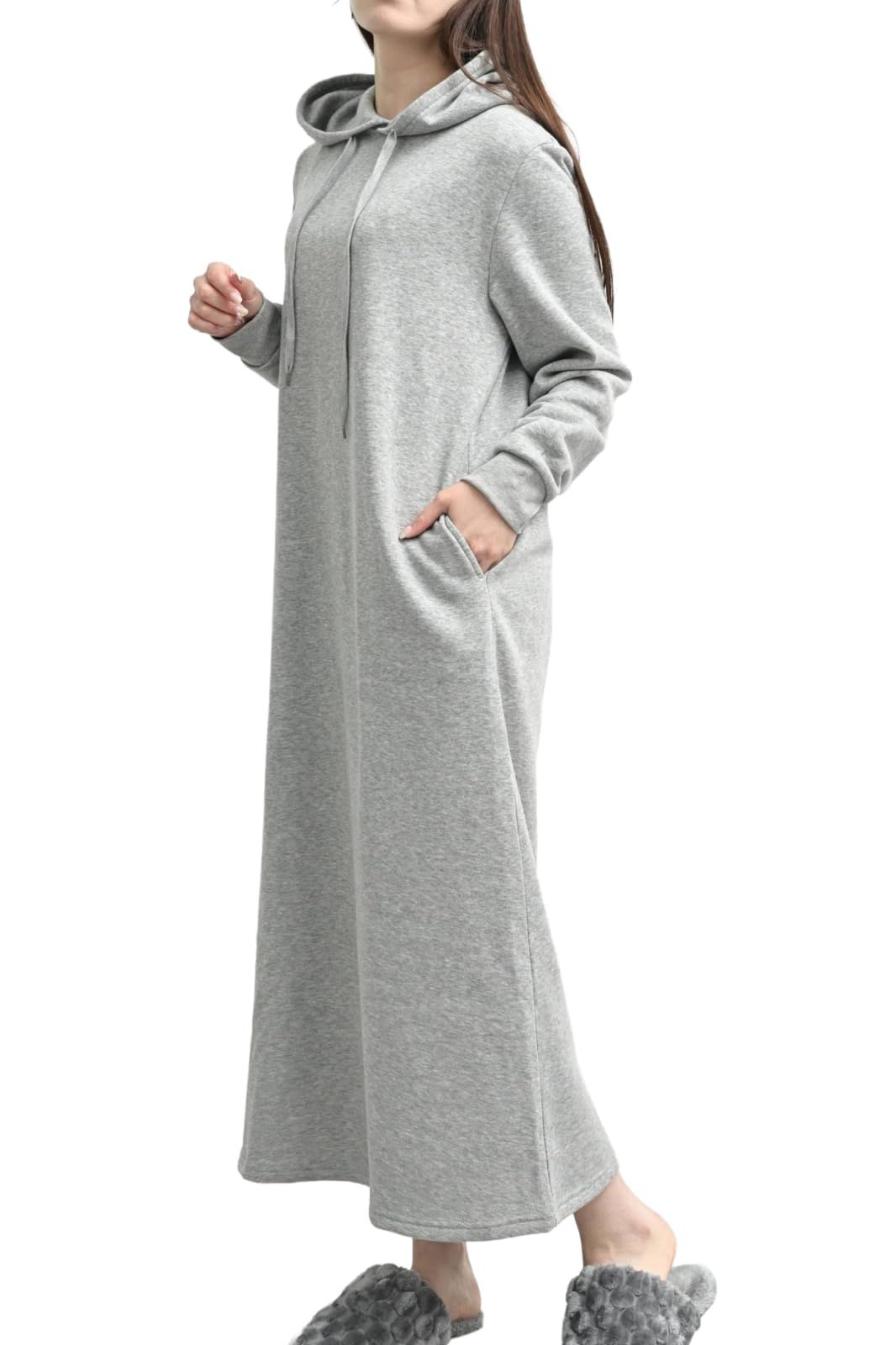 [MORE AUNI] ルームウェア ワンピース レディース 長袖 裏起毛 パジャマ 部屋着 フード付き パーカー マキシ丈 ロング丈 暖かい カジュアル ポケット付き 伸縮性 ストレッチ 綿混 ポリエステル 着やすい 動きや [グレー / 8224] [L]