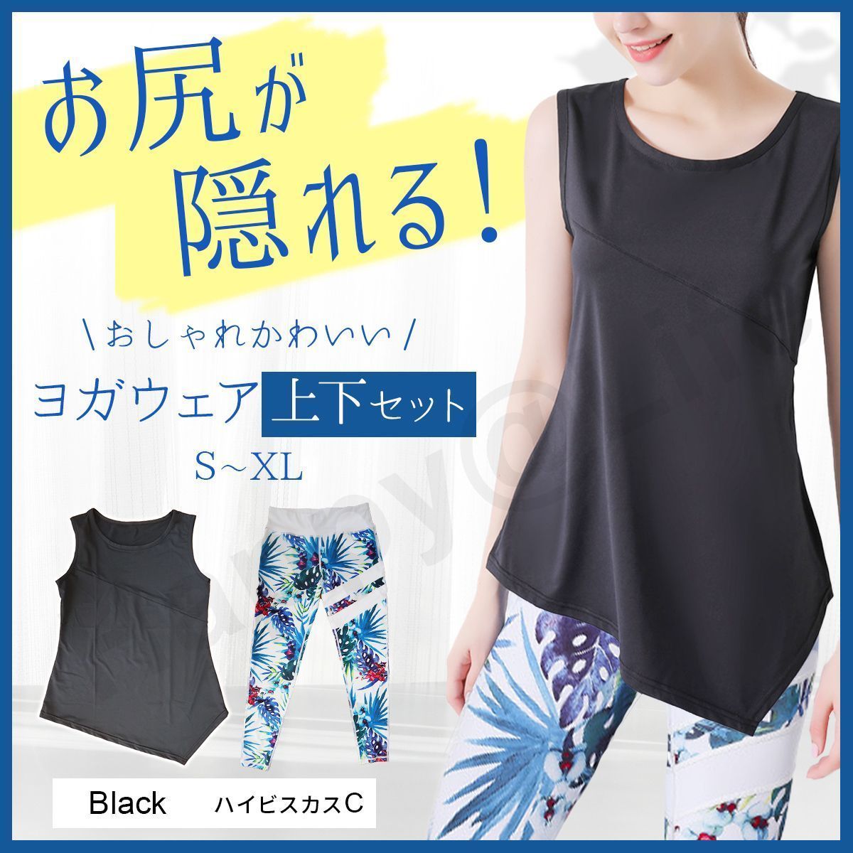 ヨガウェア ルームウェア 上下セット 体型カバー 安い おしゃれ ヨガ ハイビスカス ジャージ タンクトップ レギンス 花柄 無地 Black ブラック 黒