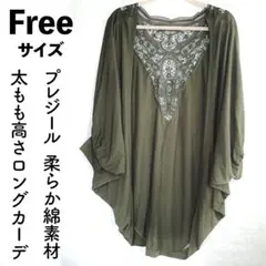 【プレジール】フリーサイズ エレガントなレース装飾 長袖カーディガン深緑色