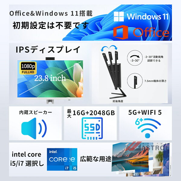 「新品・office付き」デスクトップパソコン 一体型PC デスクトップPC office付き Windows 11 22/24インチ IPS フルHD液晶 初期設定済み デスクトップパソコン インテル Intel i5/ i7 Bluetooth USB3.0 WIFI搭載 一体型パソコン メモリ 16GB 1TBSSD