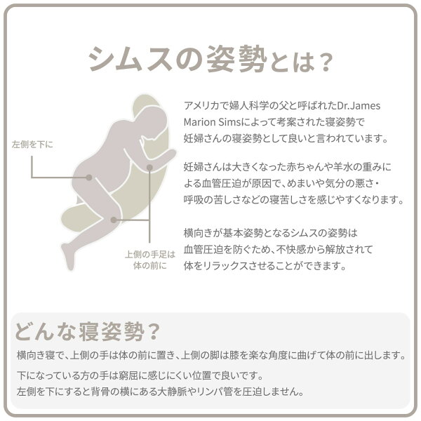 アメリカで産婦人科学の父と呼ばれたDr.James Marion Simsによって考案された寝姿勢で妊婦さんの寝姿勢として良いと言われています。妊婦さんは大きくなった赤ちゃんや羊水の重みによる血管圧迫が原因で、めまいや気分の悪さ・呼吸の苦しさなどの寝苦しさを感じやすくなります。横向きが基本姿勢となるシムスの姿勢は血管圧迫を防ぐため、不快感から解放されて体をリラックスさせることができます。