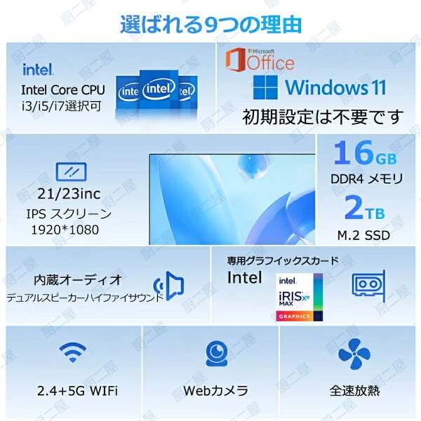 ★デスクトップパソコン 一体型pc パソコン フルHD液晶 19型 23型 インテル Core i5 i7 メモリー 4~32GB 16GB SSD 512GB 128~1024GB MS Office搭載 Win11搭載 USB 2.0 USB 3.0 5G 一体型パソコン 超薄