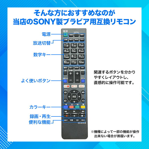 ブラビア リモコン【単4電池 付き】ソニー テレビ SONY テレビリモコン BRAVIA SN-E616-B 故障 買い替え 交換 汎用 互換 代替品 替えリモコン