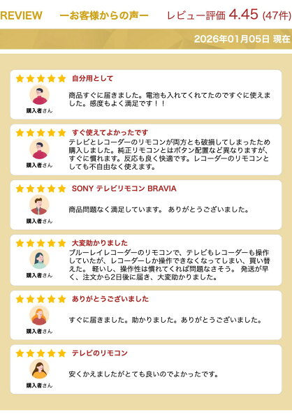 | 商品説明 | ソニーブラビアシリーズにも対応の互換テレビリモコンです。 こんな方にオススメ ・リモコンが壊れてしまった、失くした ・多機能なリモコンはいらない ・純正品は高い ・色々設定するのは面倒 当店の互換性リモコンなら ・設定不要!電池を入れたらすぐに使えます ・ソニー製の液晶テレビ ブラビアシリーズにほぼ対応 ・電源、音量調節、チャンネル変更など基本的な操作が可能 ・録画機器制御用の「再生」「停止」「早送り」など一般的なリモコンが備えている機能もあります チャンネル数字ボタンは、地デジ用に設定されています。 BS/CS放送のチャンネル変更は、チャンネル上下ボタンもしくは番組表を開いてご利用下さい。 ボタン配置や機能性が純正品と異なるため、一部機能を利用できない場合がございます ※電池は付属しておりますのですぐご利用いただけます。 まれに小さな傷がある場合がございます。 使用上問題ないレベルの小さな傷は、ご了承ください。 レコーダーには対応しておりません。 2012年以前の機種ではお使い頂けない場合がございます リモコン番号の設定を変えている場合は、本体の設定を元に戻してご利用下さい。 |