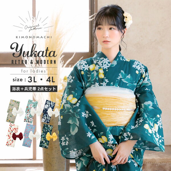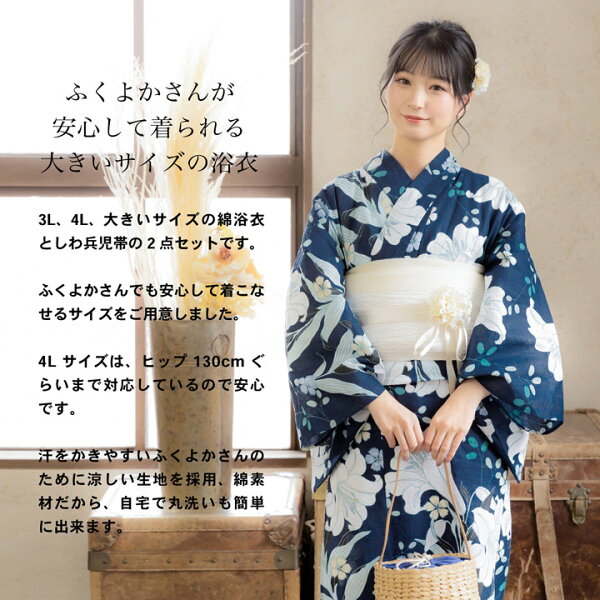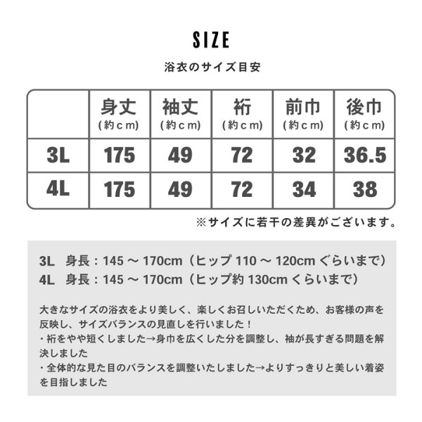 3Lサイズ、4Lサイズの大きいサイズの浴衣です。体型によって適応サイズは前後しますが、3Lは17号、19号、21号、23号、4Lは21号、23号、26号の方向けです。