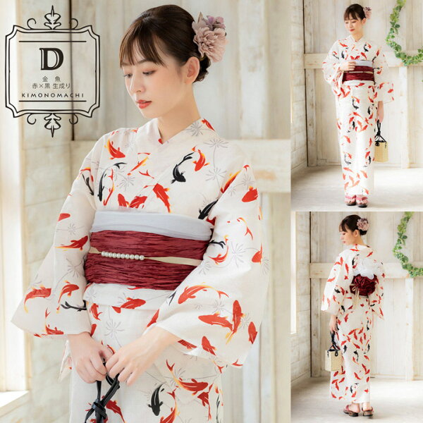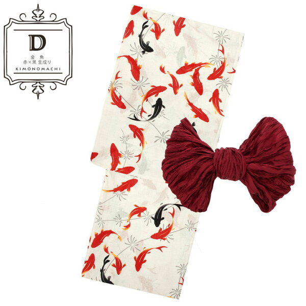 D.金魚 赤×黒 生成り浴衣:浅い生成り色の地に、グレーの水草、赤と黒の金魚の柄。金魚鉢を上から見ているかのようなデザインです。赤い金魚はヒレの先などに黄色のぼかし、黒はグレーのぼかし。色の変化がアクセントとなっています。曲線を描く水草の間を、和金のようなすっきりとしたシルエットの金魚が泳ぐ、大人にオススメの金魚の浴衣です。