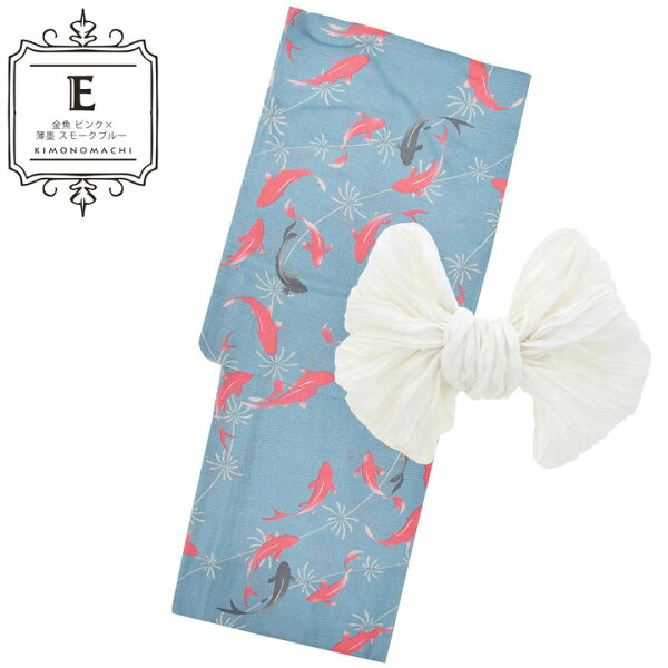E.金魚 ピンク×薄墨 スモークブルー浴衣:落ち着いたグレイッシュな水色の地に、淡いグレーの水草、明るいピンクと薄墨色の金魚の柄。金魚の体の濃淡のぼかしがアクセントとなっています。曲線を描く水草の間を、和金のようなすっきりとしたシルエットの金魚が泳ぐ、金魚鉢を上から見ているかのようなデザインです。スモーキーな地の色と浮き立つような明るいピンクの他にはない色遣いが魅力です。