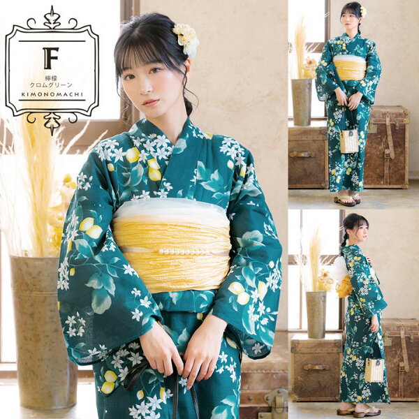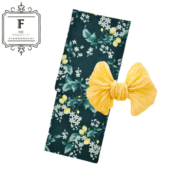 F.檸檬 クロムグリーン浴衣:暗めの青緑色の地に、花や実をつけたレモンの柄。浅い青緑と白緑色のぼかしの葉。白と淡いグレーの花。明るい黄色、白のつややかな実。レモンの瑞々しさを感じさせるデザインが、新鮮な魅力を放ちます。