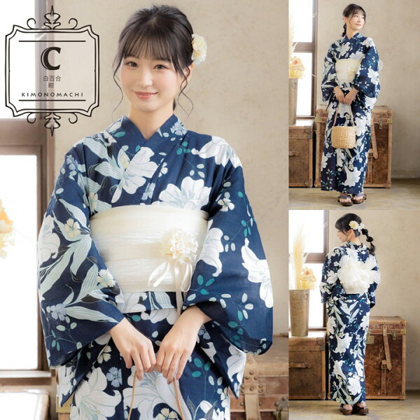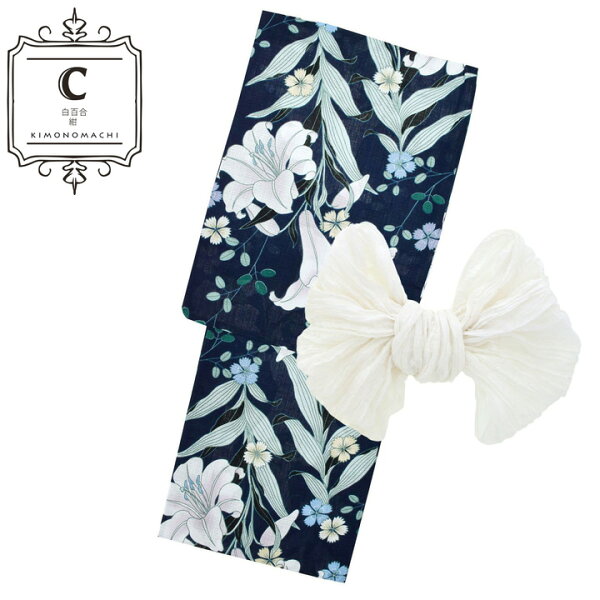 C.白百合 紺浴衣:深い紺色の地。浅い青緑の線で描かれた大きな百合の花に萩の葉、撫子の模様。白に淡い赤みのグレーのぼかしの百合の花。黒の影がアクセントになった淡い白緑色の葉。緑と薄緑の萩、淡い黄色やブルーグレーの撫子の小花が、落ち着いた中に可愛らしさを添えます。