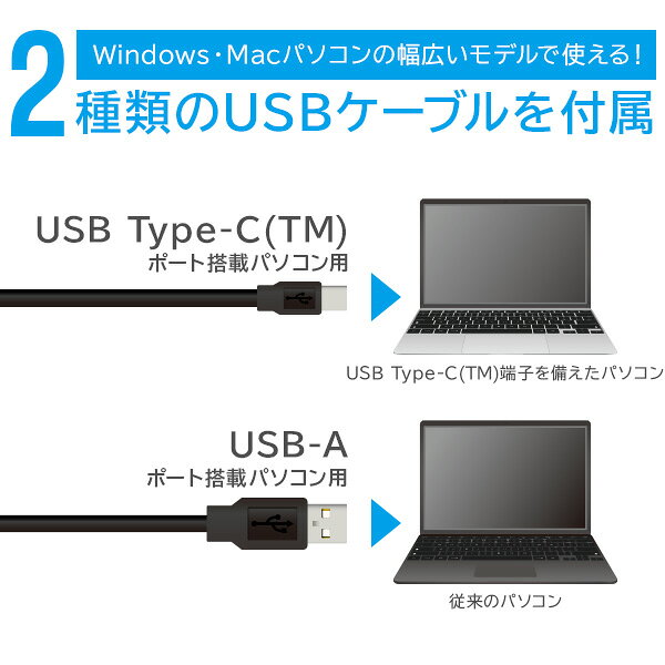 ●USB-A/USB Type-C(TM)の2種類のケーブルを付属。幅広いパソコンで使えます。