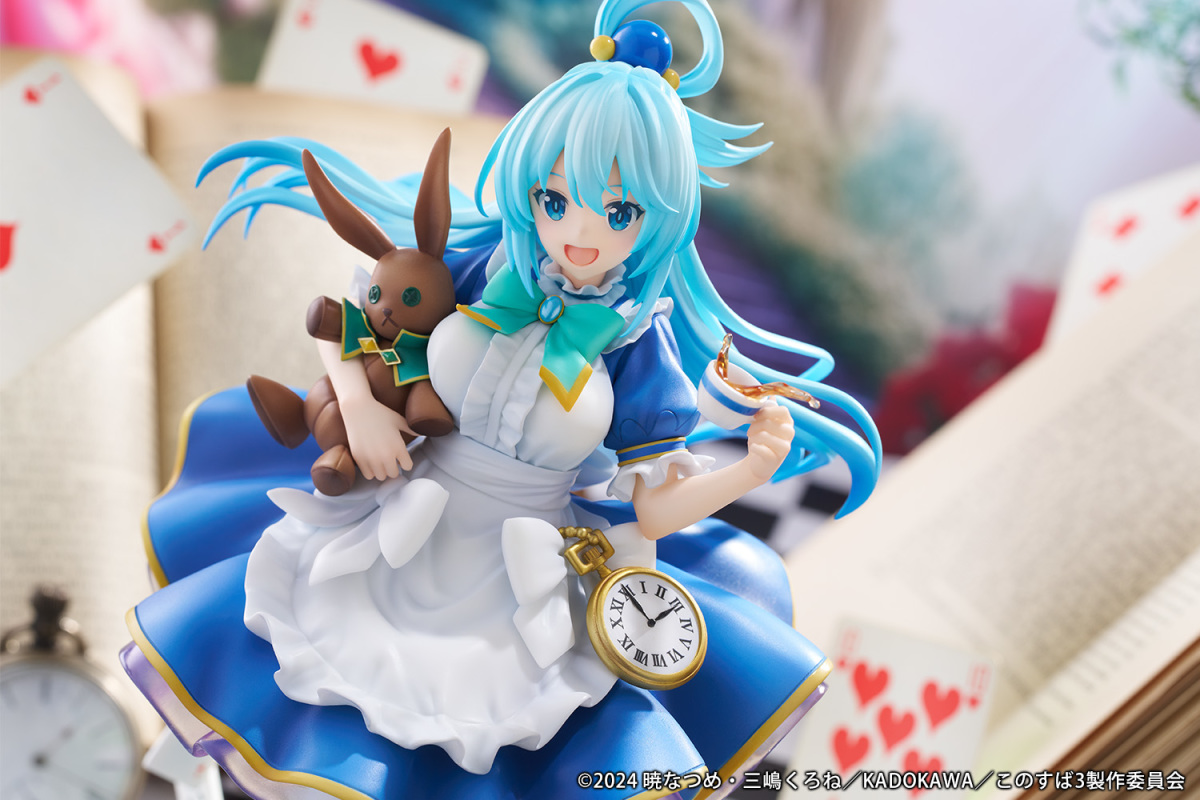 「阿克娅 童话ver.」1/7比例模型,穿着以《爱丽丝梦游仙境》为灵感的原创服装立体化登场~充满少女感的大摆裙与蓝白相间的长袜,展现出阿克娅不开口说话时难得能感受到的可爱与超凡脱俗的美貌~在细节处融入了爱丽丝梦游仙境标志性的兔子布偶、金怀表、茶杯等元素,扑克牌散落在黑白格子底座上,不只营造出动态感,还展现出和真造型的黑桃K卡牌小彩蛋!整体非常丰富多彩~