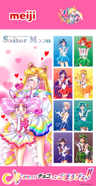 Dans le cadre des célébrations du 30e anniversaire de Pretty Guardian Sailor Moon, Meiji Co., Ltd. lance une série de campagnes de collaboration en magasin à travers le Japon. Les Moonies pourront obtenir des goodies exclusifs Sailor Moon en achetant des chocolats Meiji éligibles, chaque enseigne proposant ses propres articles uniques.