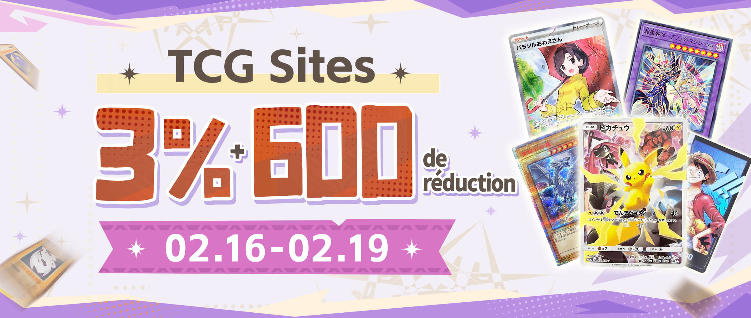 Cet événement inclut les produits TCG sur notre plateforme, ainsi que les TCG de Mercari, Rakuma, Rakuten, JDirectItems Auction et JDirectItems Fleamarket