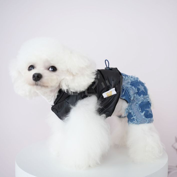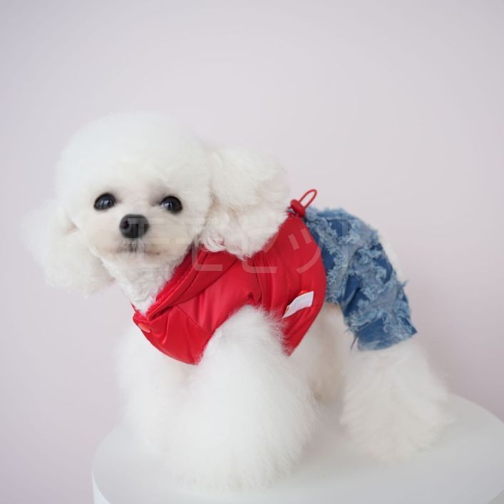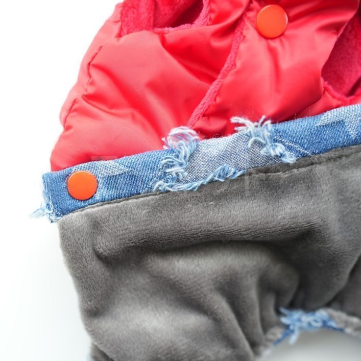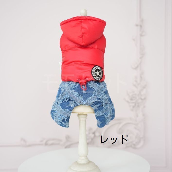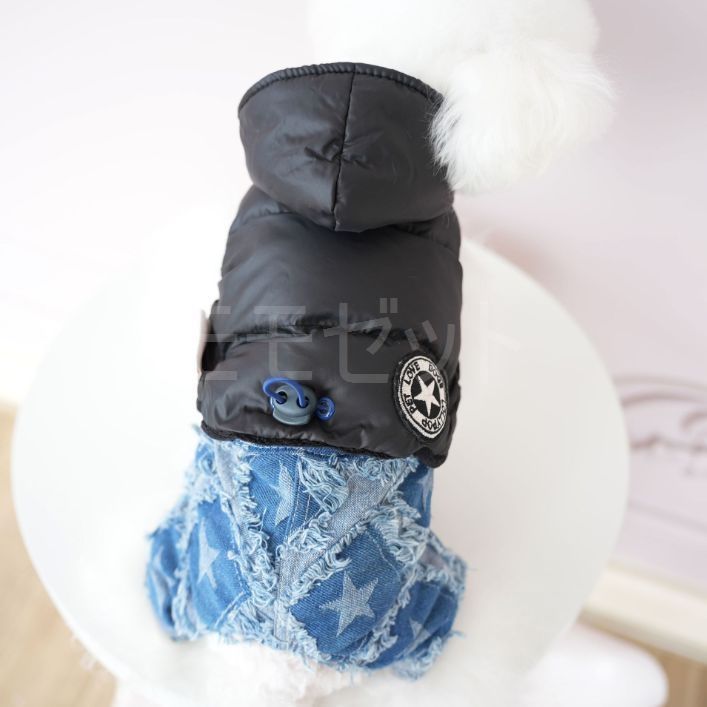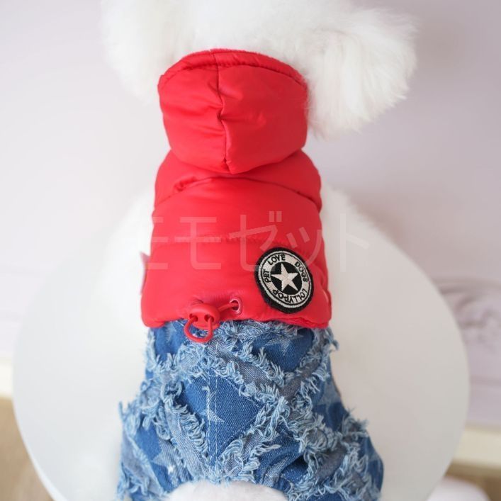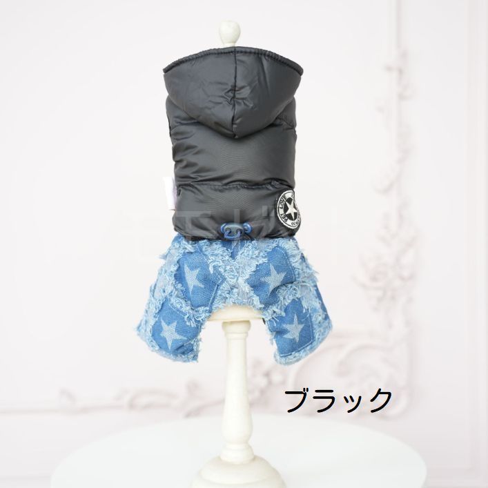 [秋冬新作]ダウンパーカとデニムパンツのつなぎ★ボタンで上下着脱可能♪ブラックレッドXSSMLXLペットウェア犬服小型犬用サロペットロンパースカバーオール厚手ジーンズアウトレット価格
