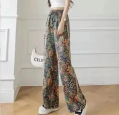 ワイドパンツ 総柄 アイスシルク ダンス ルームウェア ヨガ フリーサイズ