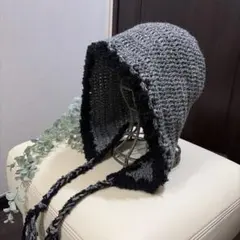 ☆ボア付き パーカーのフードのような ニットフード☆霜降りブラック