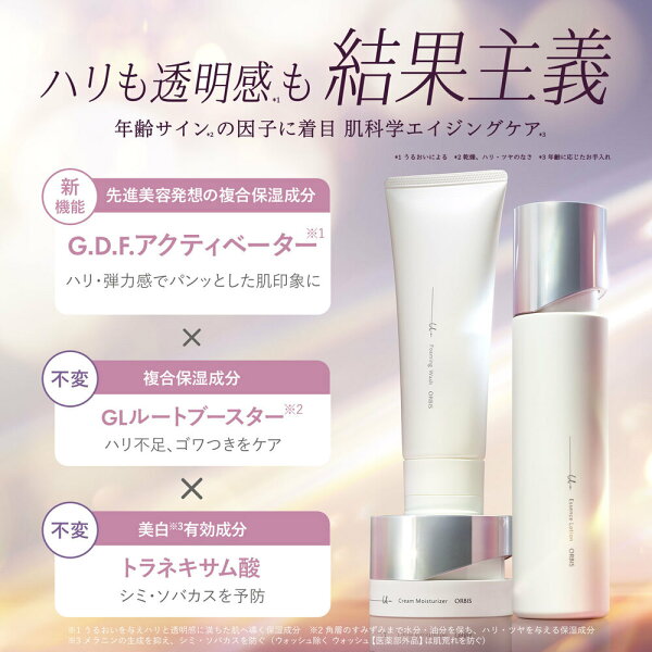 *1 気持ちのこと *2 うるおいによる *3 メラニンの生成を抑え、シミ・ソバカスを防ぐ(ウォッシュを除く) *4 オルビス内スキンケアシリーズの保湿力 *5 年齢に応じたお手入れのこと *6 ハリと透明感の低下により立体感のない印象になること *7 うるおいを与えハリと透明感に満ちた肌へ導く保湿成分 *8 ハリ・透明感による *9 角層のすみずみまで水分・油分を保ち、ハリ・ツヤを与える保湿成分 *10 乾燥による *11 角層まで