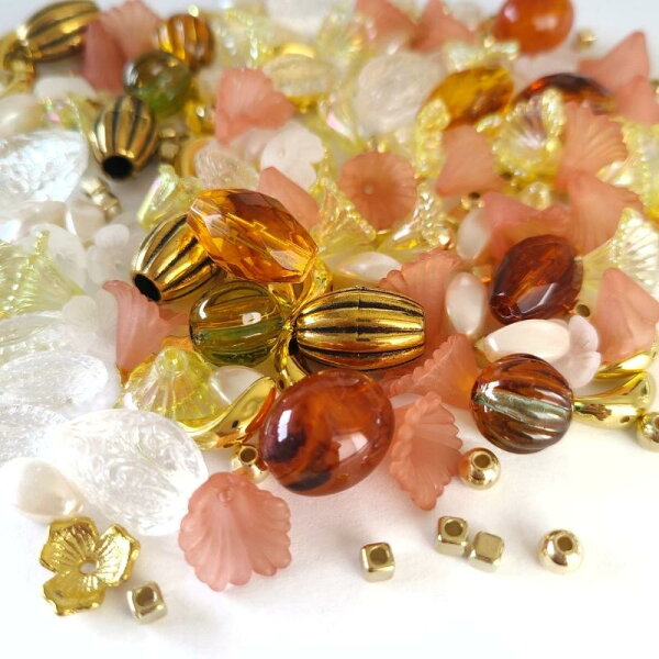 気まぐれアソートe ビーズミックス 【 オレンジ & べっこう風 & ドロップ & スペーサー & フラワー アクリルビーズ ミックス 】 ビーズアソート 50g 大容量