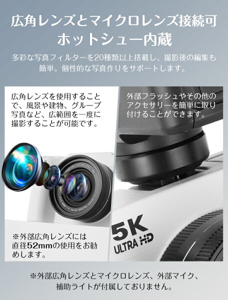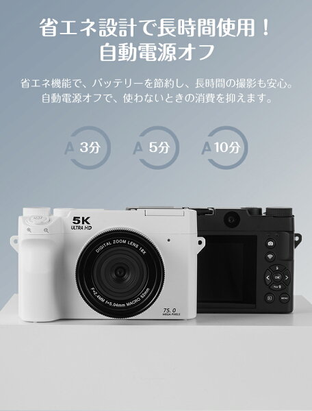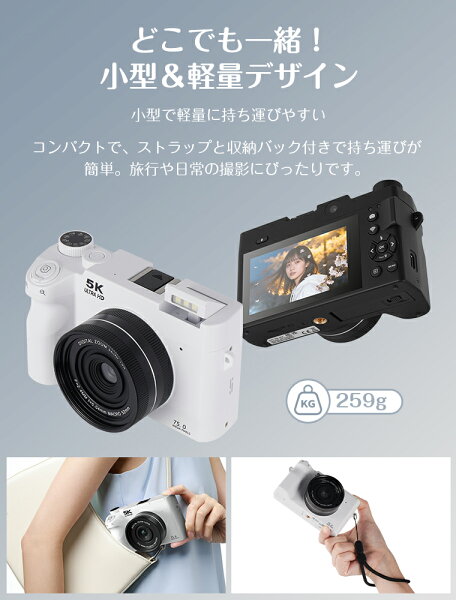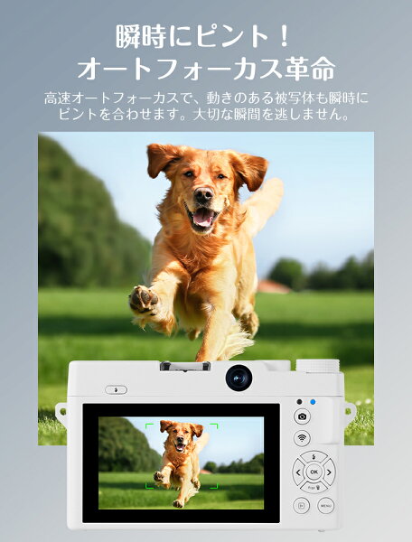 このデジタルカメラはオートフォーカス機能を搭載しております。シンプルな操作で自動的にピントを合わせて、初心者でも鮮明的に写真を撮ることができます。(シャッターボタンを浅い押してピントをあわせます。更に深く押して撮影できます)。5K動画撮影また1080Pビデオ解像度と最大7500万の写真解像度という高画質で、いつでもご家族やお友達との楽しい時間をとらえて記録できます。