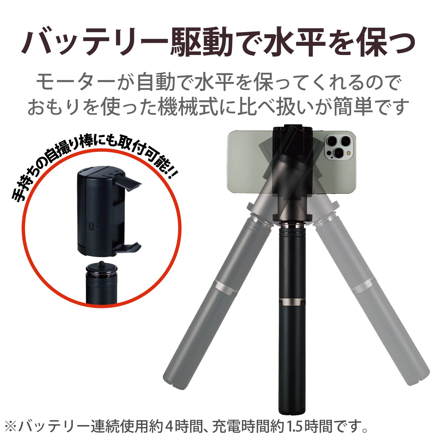 | 付属品: | 三脚、スタビライザー、充電差込口のフタ、USB micro-Bケーブル 約25cm(コネクター含まず)、取扱説明書 |