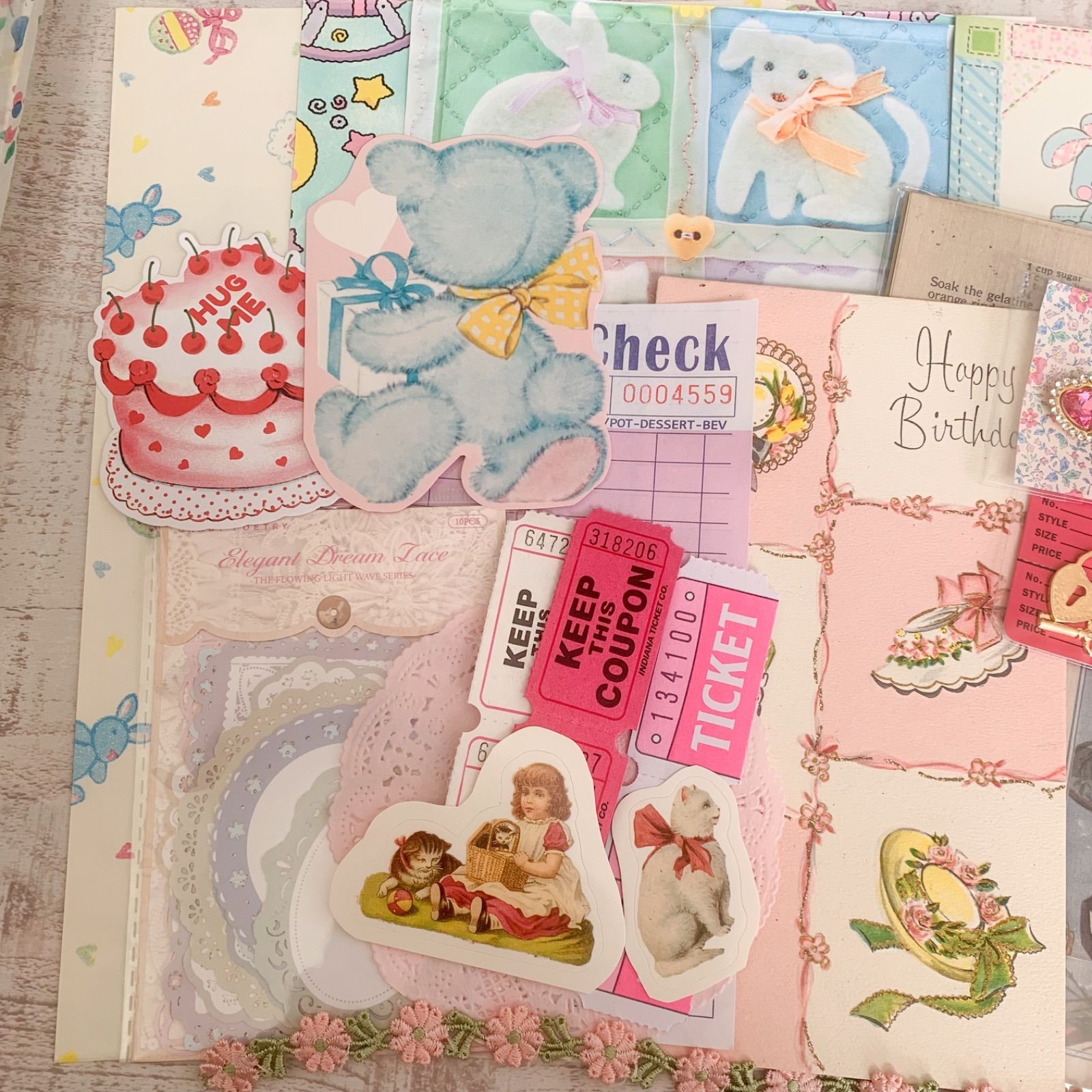 ・国内素材(ヴィンテージレシピ風コラージュペーパー(15枚)・レースステッカー(新品)・デコパーツなど)