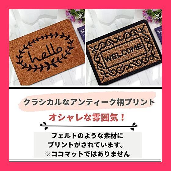 3world アンティーク 柄 プリント 薄型 泥落とし 玄関マット 屋外 屋内 滑り止め加工 SW1318 ココマット hello 一点物の早い者勝ちのおすすめ人気商品です!! ~~~~~~~~~~~~~~~~~~~~~~~~~~~~~~~~~~~~~~ クラシカルなアンティーク柄プリント!コアな柄プリントがかわいい玄関マットで家族やお客様をお出迎え。おしゃれな雰囲気が目を引きます。屋外にも屋内にも兼用でお使いいただけます。 玄関の泥よけマットや上り口マットとしてはもちろん、お部屋のインテリアとしてリビングや洗面所、トイレ、ペット用マット(ノンシャギーの為爪が引っ掛かりにくい)などなど・・多用途にお使いいただけます。 裏面は天然ゴムを使用。ノンスリップ加工のハイセンスなマットです。 フラットで薄くドアの開閉の邪魔にならない厚みですが、表面はポリエステル素材で吸水性があり乾きやすくお手入れも簡単です。 サイズ:約40x60cm 厚さ:約4* 重量:約340g *素材*表面:PET 裏面:天然ゴム。ノンシャギー・・糸の飛び出しなし!ハサミなどでカットしてもほつれませんので、スペースに合わせて加工可能 ※ 他にはない様々な柄の玄関マットを販売中です。「3world 玄関」で検索し、お好みのデザインを見つけて下さい。 配送について、商品のサイズや配送先都道府県によって最適な配送業者を選択しております。 業者・配送方法の指定は承れません。ご了承ください。 万が一の不着、紛失の場合など、最後まで責任をもって対応しますので、ご安心ください。 ぜひご購入検討のほどよろしくお願いいたします。