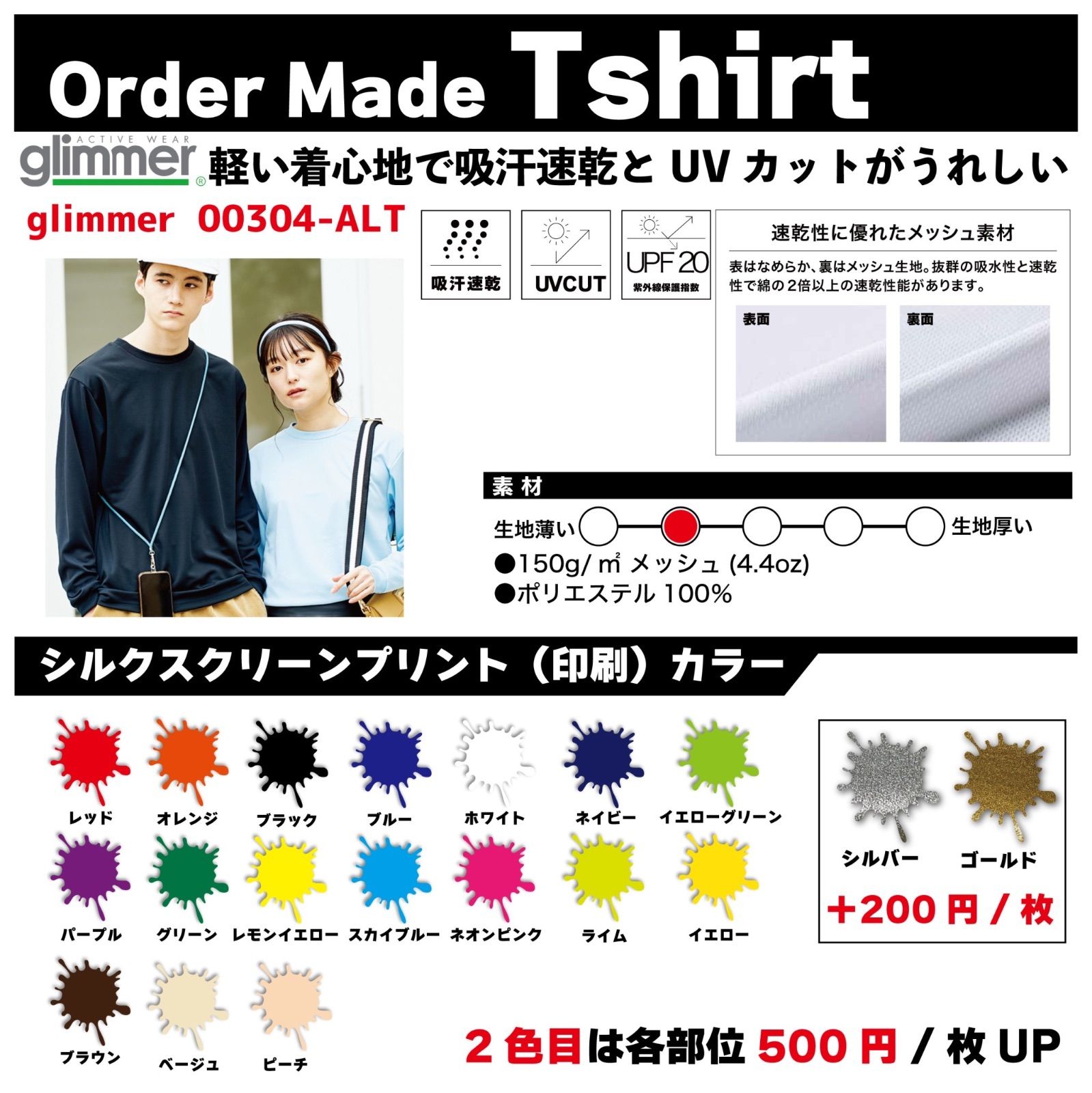 シルクスクリーン印刷、フルカラープリント、ラバー転写プリント、昇華転写プリントよりお客様のご要望に合わせてご提案させていただいております。