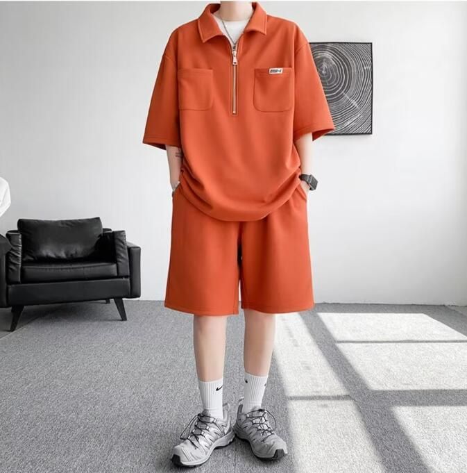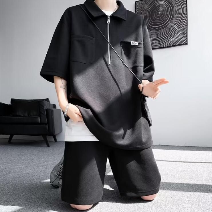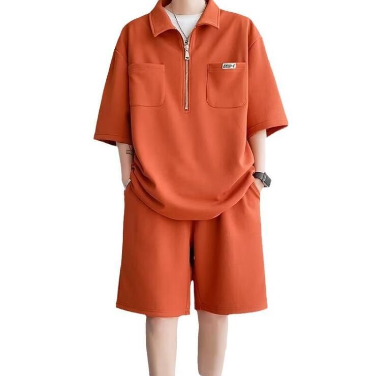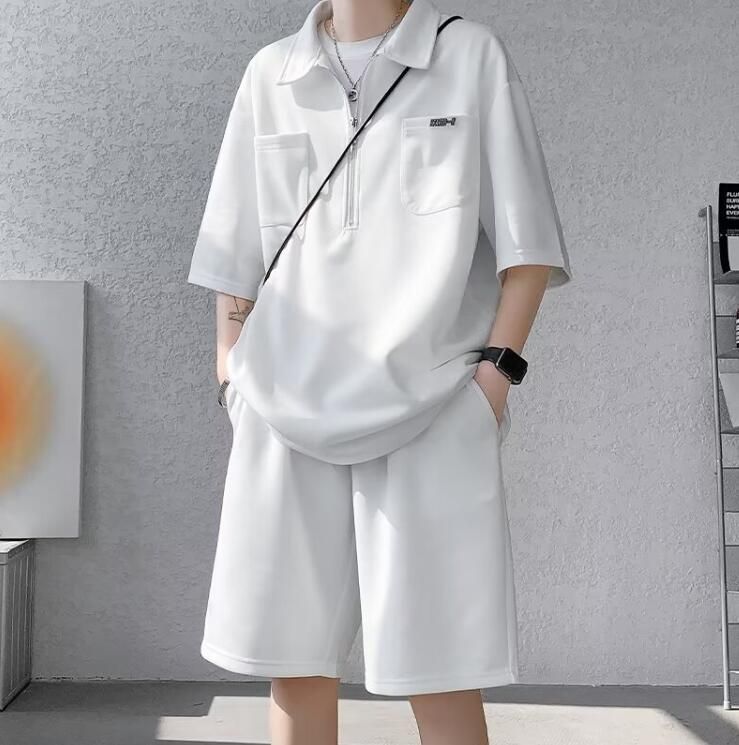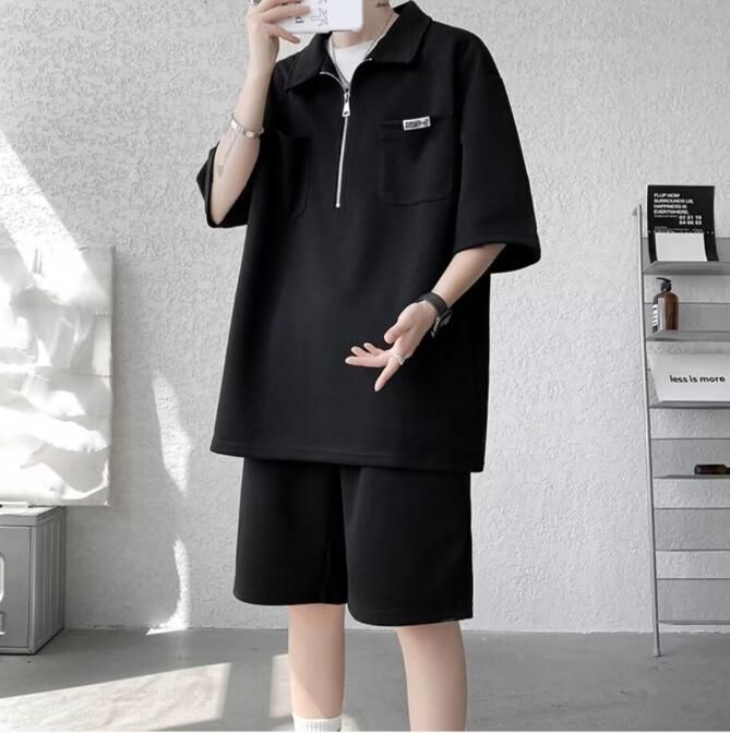 大きいサイズ セットアップ 夏 メンズ 半袖シャツ ハーフパンツ ジャージ上下セット 折り襟 無地 ゆったり アウトドア ハーフジップ プルオ