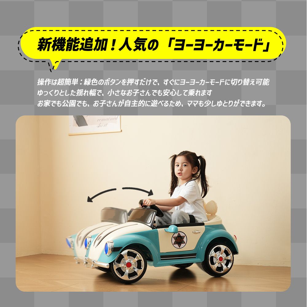 この商品はまとめ割対応:2個購入は2%割、3個購入は3%割。 ※送料は個数に応じて加算され、まとめ買い割の対象外となります。 (沖縄への発送は不可)。 ---------- 商品特徴 【電動乗用ラジコンカーの大人気機】「ドイツオールドタイプ」は、場面を選ばず大活躍!結婚式場での記念撮影イベントでの特別景品ライフイベントでの思い出作りさらには店舗のアピールディスプレイまで ??さまざまな用途でたくさんご利用いただいております。 【COLOUR 2色 ブルー/ピンク】ステッカーは本体とは別に同梱されています。もしステッカーがお好みでない場合は、貼らないでご使用いただくことも可能です。 【フォルクスワーゲンからエンパワーメントを取得します。正規ライセンス商品で、本格的外観に多彩な機能を満載します。】電波法は守っている?不法電波で重要な無線通信を妨害した場合は5年以下の懲役または250万円以下の罰金が課せられます。技適マ-クらが付いていない無線機は違法になる恐れがあります。ご安心ください!当店の電動乗用カーは電波法と電気用品安全法適合の商品です。  電波法に従って技適マークを取得しています。PSEマークを取得しています。当店の電動乗用カーはお子様に頼もしい製品です。 【本格的外観】ドアロック付き 本格的なホイール 座席&シートベルト ミラー付き フットペダル LEDライト 【ミュージックプレイヤーMUSIC PLAYER】1.内蔵ミュージックももちろんお好みの音楽をノリノリ再生!2.お子様のお好きな音楽で楽しくドライプUSBフラッシュメモリでの再生も可能。 【お子様にも簡単に操作する!】電源ボタンを押してスタート!ハンドル操作で左右回転!ホーンボタン:押すとサウンドが鳴ります。ペダルを踏んで前進/後退 赤色のボタン:前進/後進切替 【レバー新機能追加!】人気の「ヨーヨーカーモード」 操作は超簡単:緑色のボタンを押すだけで、すぐにヨーヨーカーモードに切り替え可能ゆっくりとした揺れ幅で、小さなお子さんでも安心して乗れますお家でも公園でも、お子さんが自主的に遊べるため、ママも少しゆとりができます。 【プロポ操作でき、ママも安心】スピードは調整可能 低速:2.13km/h中速:2.35km/h高速:3..17km/h 大人がプロポでスピードを調整できます。 ~~~~~~~~~~~~~~~~~ ※特殊配送サービス※ 指定配送/住所変更サービスについてご案内いたします。ご希望の場合は、別途手数料300円(税込)が発生いたします。 SKU:N509P335816A
