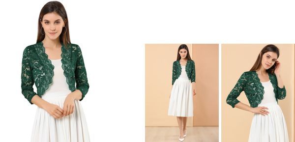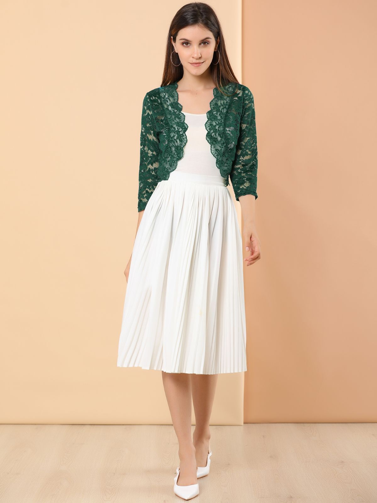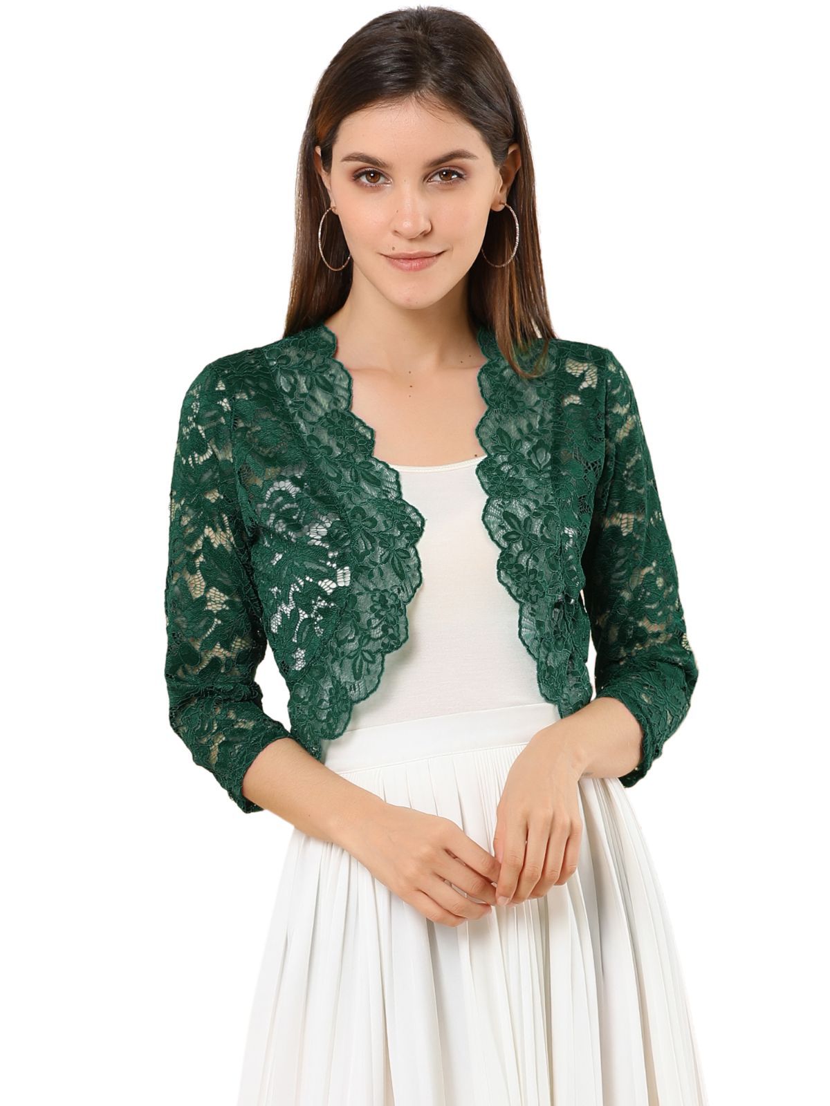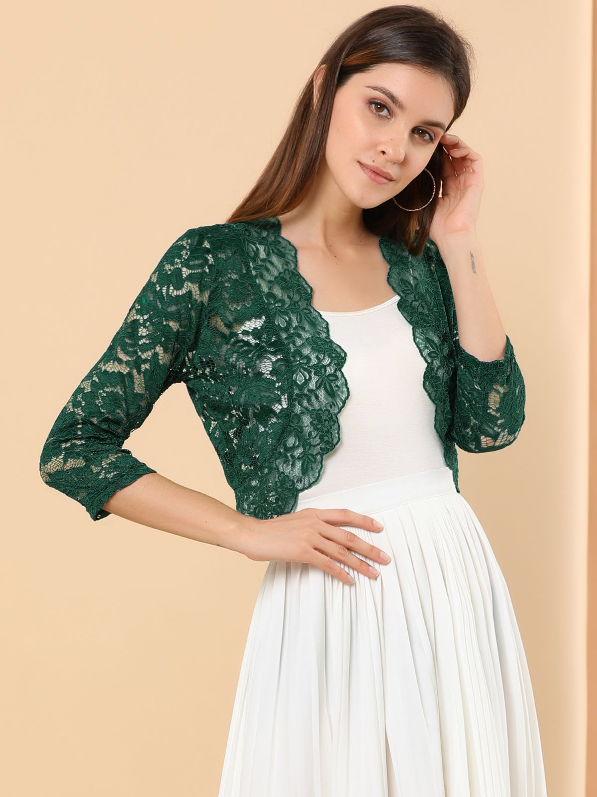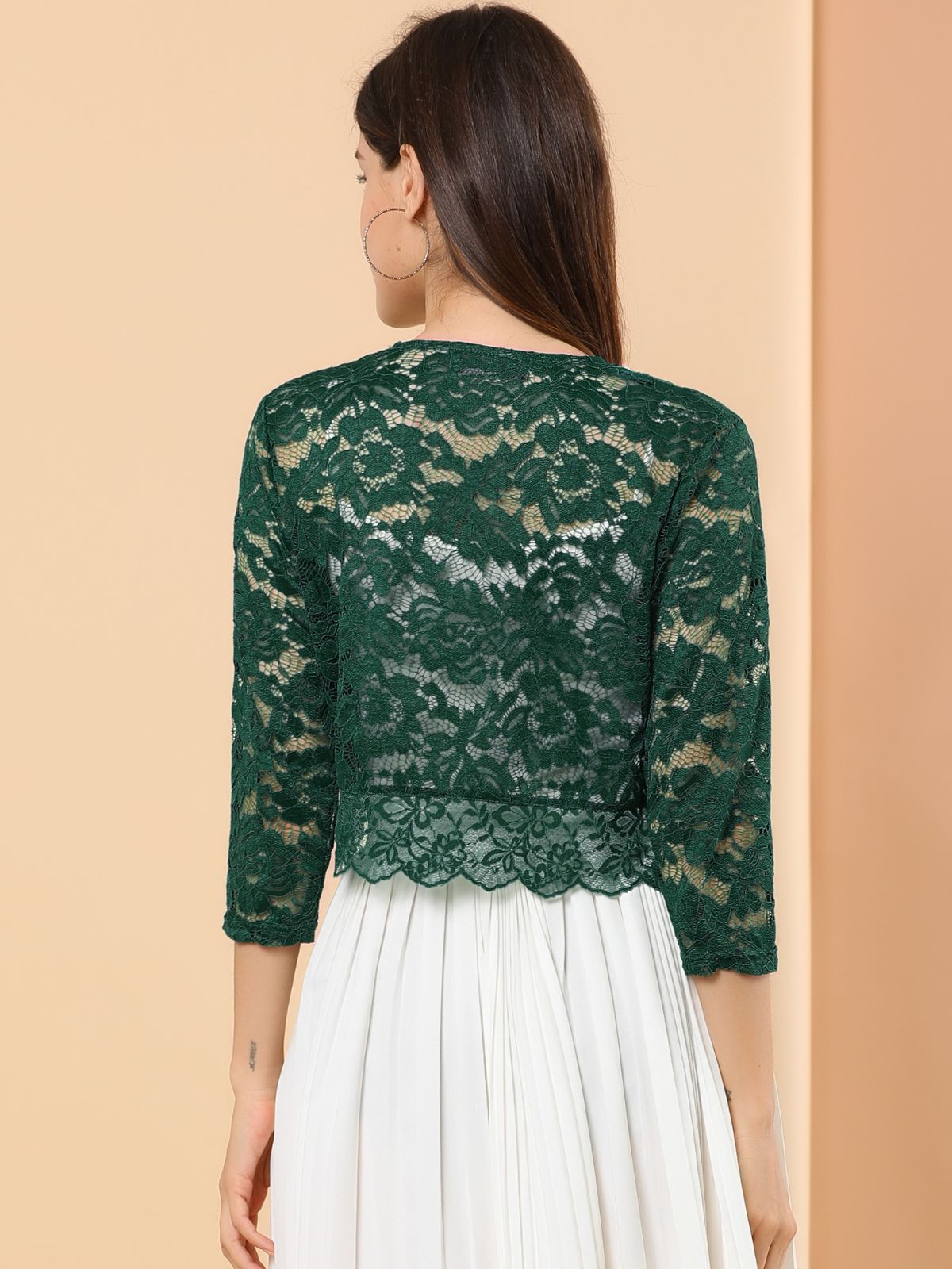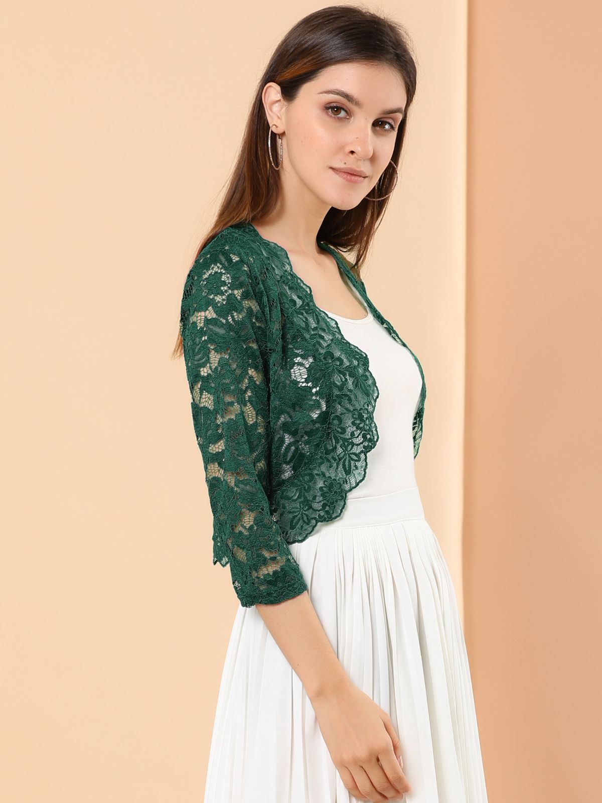 ボレロ シュラグトップス、薄手の花柄レース、七分袖、織り目加工の生地、前開き、オープンフロント